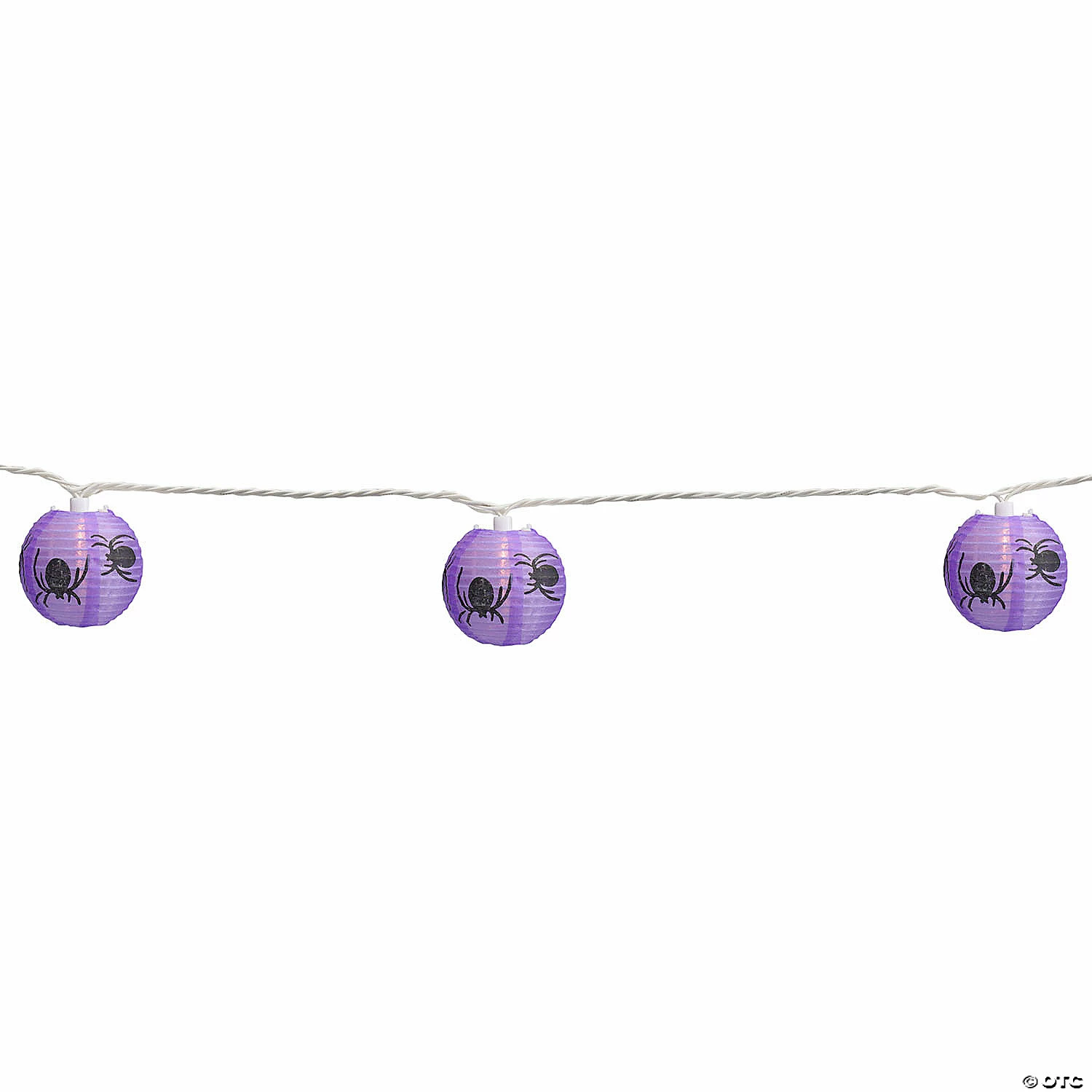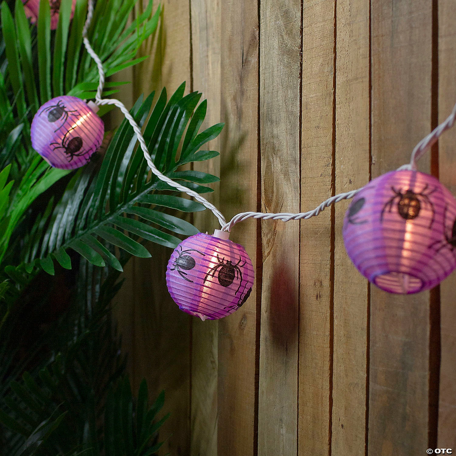 Illuminate your patio or porch with these paper lantern lights. This strand of clear mini lights has purple paper lantern covers with black spider designs. These lights will be the perfect addition to your Halloween party. The mini light will shine brightly through the lanterns lighting up any space. Product Features: Purple and black spider Halloween paper lantern light set. Color: clear bulbs / white wire. Number of bulbs on string: 10. Bulb size: mini. Bulb type: incandescent. Spacing between each bulb: 12″. Lighted length: 8.75′. Total length: 11′. 24″ lead cord. 5″ tail cord. Additional Product Features: Super bright bulbs. UL certified and approved for indoor or outdoor use. If one bulb burns out the rest will stay lit. Comes with replacement bulbs and spare fuses. Contains end-to-end connectors which allows you to connect multiple sets together (not to exceed 210 watts). 120 volts 60 hertz .06 amps 7.2 watts. Lantern Dimensions: 3″ high x 3″ diameter. Material(s): plastic/metal/paper Special Shipping Information: This item ships separately from other items in your order. This item cannot ship to a P.O. Box. This item may be subject to additional processing days. Item is not eligible for expedited shipping. You may initiate a return for unused items within 30 days, if the items are in original packaging with all original materials included with the shipment.