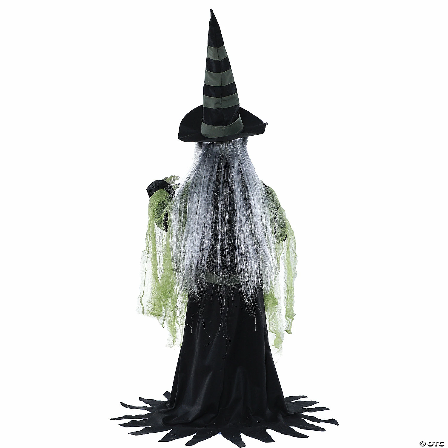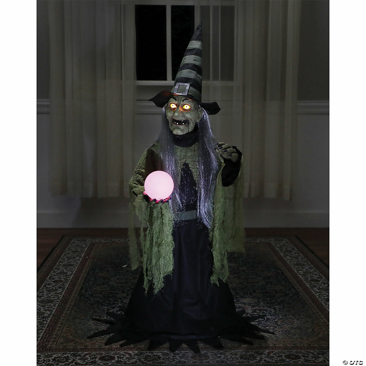 Step right up, step right up! Come see the 36-Inch Animated Fortune Teller Witch! This spooky animatronic will have you entranced with her bewitching movements and ethereal light show. Watch her eyes light up yellow as she speaks her spells and cackles an eerie laugh! Enjoy the changing colors of her orb as Her Head and Hands move side to side. Her smaller height means you can tuck her into your haunted scene easily for a great effect. Don’t miss out on this enchanting experience!