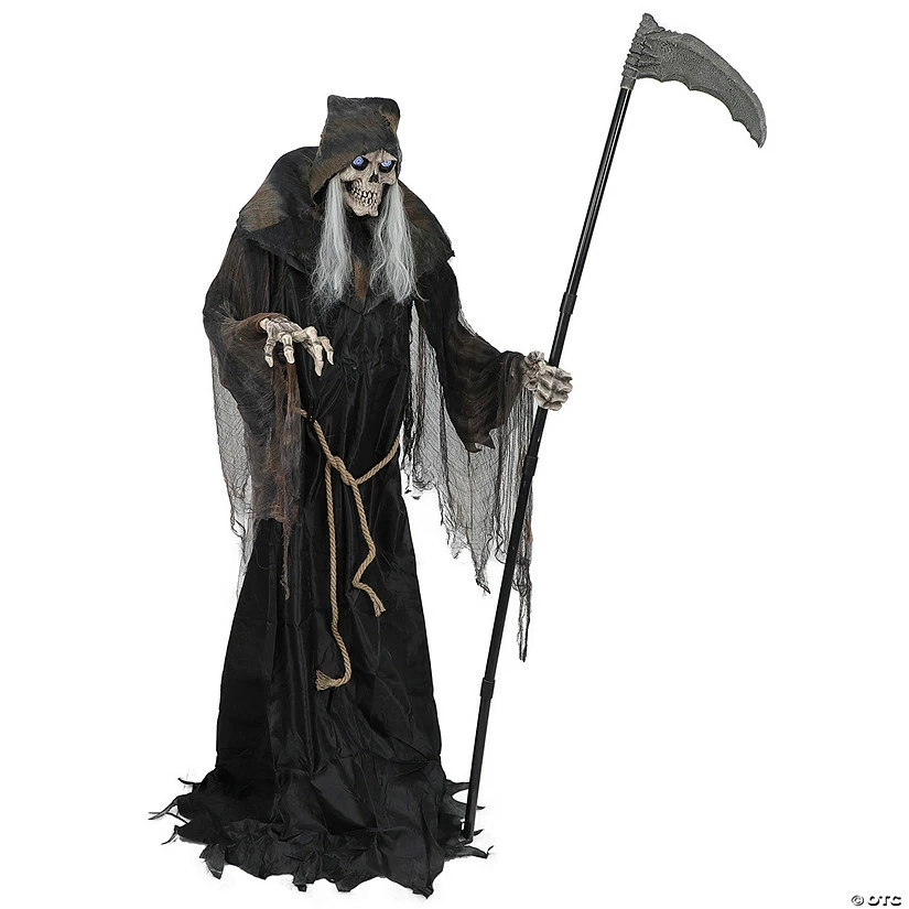 He always knows when your time has come! The 6-foot Lunging Reaper Animated Prop with patented Digiteye technology will add the element of surprise to your next Haunted Scene! His amazing pale eyes appear to look around, and his Mouth Moves as he says 4 scary phrases:Phrase #1: “Want to play a game of tag? If I catch you, you have to give up your soul! Aarr!! you are faster than you look. But don’t worry, I’ll get that soul one way or another!”Phrase #2: “Do you think that you can sneak past the reaper? I always know when your time has come&hellipGotcha!! Hahahaha Lucky for you, it’s not your time&hellipyet hahahaha!”Phrase #3: “The living never think that their lives will come to an end, but all it takes is one touch from me &ndash ooh hoo hahah!! You have escaped my grasp&hellipfor now hahahaha!”Phrase#4: “I have come to guide one of you into the afterlife. Come into my embrace and meet your fate!! Hahhaha don’t worry, I will return for you soon enough!”Holding his Plastic Scythe, at the moment you least suspect, The Reaper Lunges toward you! Three activation options include, Steady-On, Infra-red Sensor, or Step-Here Pad. There is also a volume control so you can adjust to your surroundings. Constructed of durable metal rods that snap together, this piece is easily assembled in less than 30 minutes.The included Universal Adapter has 4 interchangeable plugs, and works in the USA, UK, Germany, and Australia.