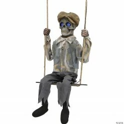 Everyone will be afraid to come up to your house with the Swinging Skeletal Boy around! This creepy prop features a Victorian-era skeletal boy with hollowed out eyes that glow an other-worldly blue and speaks haunting phrases to all passersby as his head turns side-to-side while he swings back and forth on his swing. Your haunted house will never be the same with the Swinging Skeletal Boy! Animation: Eyes glow blue Head turns side-to-side Swings back and forth on swing. Phrases prop says: inchesHello. Do you want to play? I’ve been swinging here waiting for you, for years and years. You have such nice skin…can I have it? (giggle) That’s okay, I’ll come get it when you’re sleeping. I’ll make you one of us, then you can swing forever too (giggle)! inches, inchesOne, two, I’m a you, Three, four, breaking down your door, Five, six, beware of my tricks, Seven, eight, you will not escape, Nine, ten, this will never end! (Giggle) inches. Activation options: Steady-on, Infra-red sensor (works up to 6.5′ feet away & works in all lighting conditions), Step-here pad (included). Power: UL power adapter that plugs into any standard outlet. Materials: Polyester, PVC, sponge, plastic, hemp rope, electronics. Assembly required. Fixed height 62 inches, width 16 inches, animation right to 50 inches, depth 18 inchesSpecial Shipping Information: This item ships separately from other items in your order. This item cannot ship to a P.O. Box. This item may be subject to additional processing days.ITEM IS NOT ELIGIBLE FOR EXPEDITED SHIPPING
