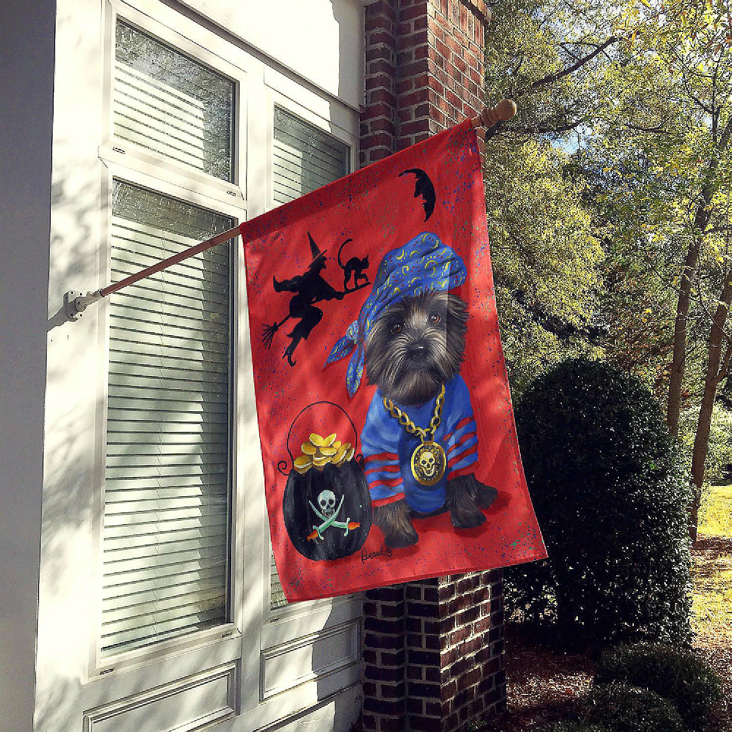 Cairn Terrier Black Pirate Halloween Flag Canvas House Size. Flag Canvas House Size featuring breed specific Cairn Terrier artwork. Celebrate Halloween with this Halloween Large Flag. Heavy Duty Polyester House Size Decorative Sleeve Pole Flag. Each flag measures approximately 28 x 40 inches. This flag is sewn and made one at a time and may vary slightly in size. This is a sleeve pole flag that will fit a standard decorative flag pole. The flag pole and bracket are not included and should be purchased seperately. The flag is printed on both sides of the fabric with one side mirroring the other side. Each flag is printed in full color and they dyes are heat set for durability. This Large Flag is from Caroline’s Treasures Dogs category of products.