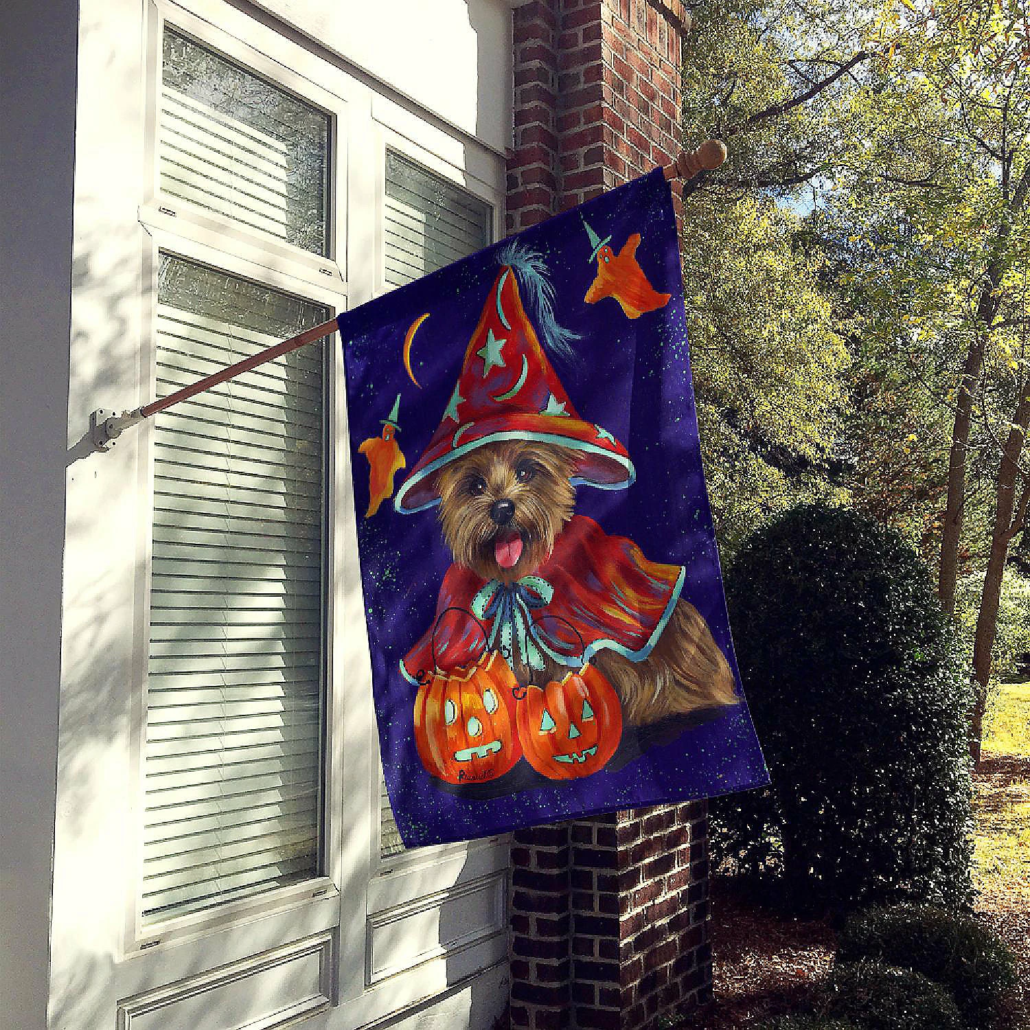 Cairn Terrier Halloween Witch Flag Canvas House Size. Flag Canvas House Size featuring breed specific Cairn Terrier artwork. Celebrate Halloween with this Halloween Large Flag. Heavy Duty Polyester House Size Decorative Sleeve Pole Flag. Each flag measures approximately 28 x 40 inches. This flag is sewn and made one at a time and may vary slightly in size. This is a sleeve pole flag that will fit a standard decorative flag pole. The flag pole and bracket are not included and should be purchased seperately. The flag is printed on both sides of the fabric with one side mirroring the other side. Each flag is printed in full color and they dyes are heat set for durability. This Large Flag is from Caroline’s Treasures Dogs category of products.