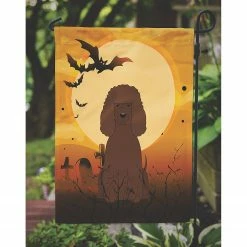 Halloween Irish Water Spaniel Flag Garden Size. Flag Garden Size featuring breed specific Water Spaniel artwork. Celebrate Halloween with this Halloween Garden Flag. Artwork for your garden, patio or yard. This is a thick Double sided garden flag made from two pieces of polyester fabric. This 2 ply garden size flag is water resistant and weather proof. Words on the flag can be read correctly on both sides of the garden flag. Heavier than most other garden flags available. This flag will hold up in wind, rain and snow. Make your personal statement in your outdoor decor with this colorful quality garden flag. The flag measures approximately 11 1/4 inches x 15 1/2 inches. The flag has a 1 1/2 inch sleeve sewn in to allow you to attach the flag to any standard garden flag stand or garden size porch hanger. The garden stand is sold seperately. This Garden Flag is from Caroline’s Treasures Dogs category of products.