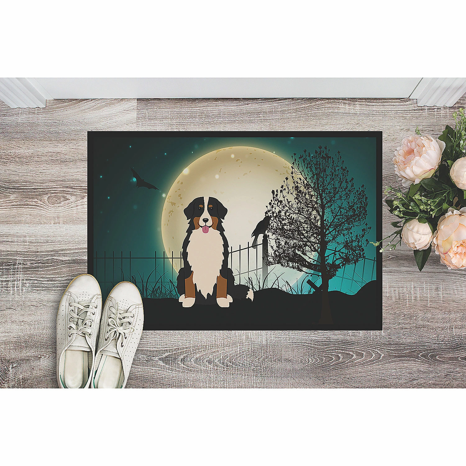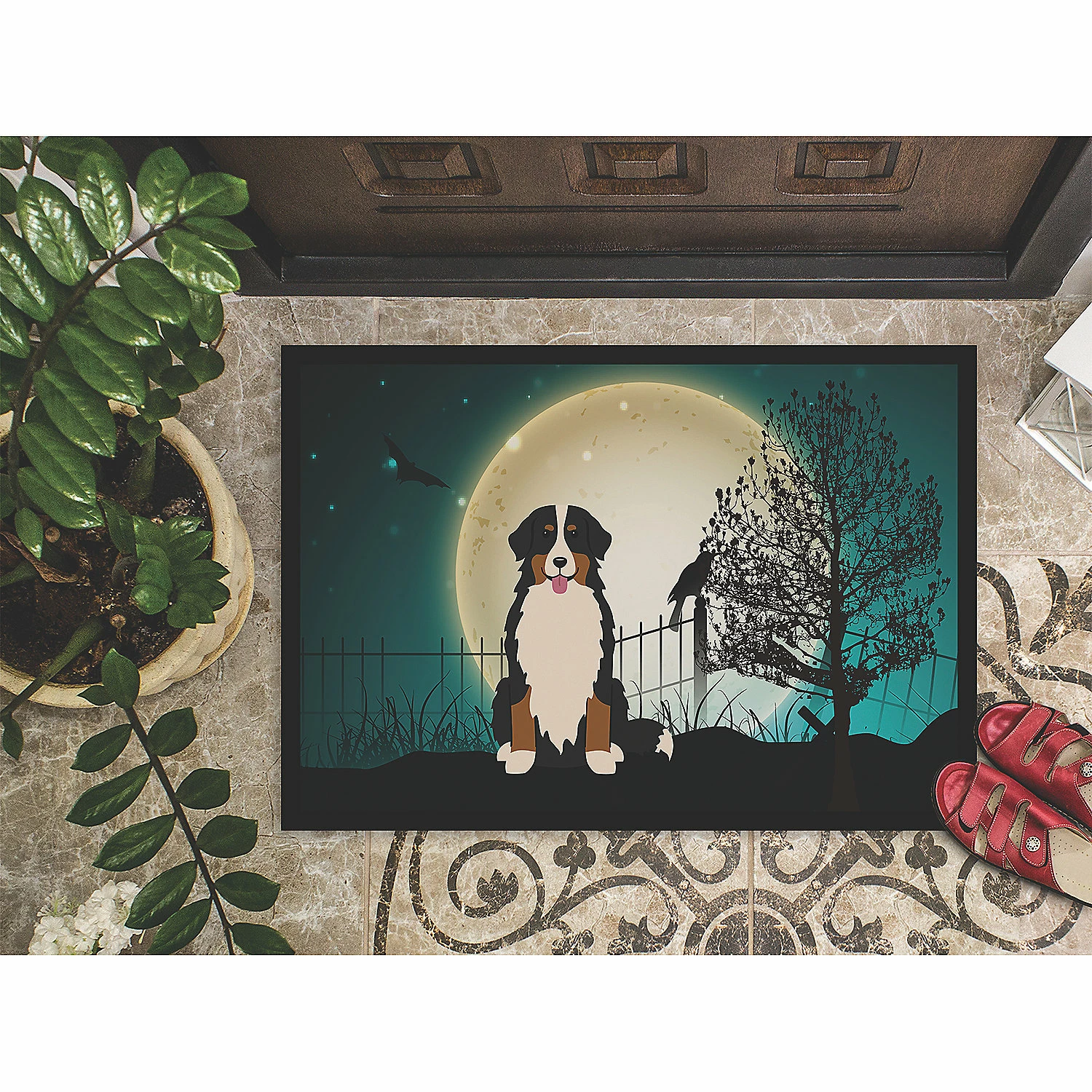 Halloween Scary Bernese Mountain Dog Indoor or Outdoor Mat 24×36. Indoor or Outdoor Mat 24×36 featuring breed specific Bernese Mountain Dog artwork. Celebrate Halloween with this Halloween Doormat. Welcome your family and friends with this Artwork mat in full color. This action backed mat with hold up in almost any weather condition. This door mat measures about 24 inches by 36 inches and has a black binding tape to hold it’s many layers together. The top layer is a polyester felt that is dyed with the image that you see on the mat. The next couple of layers give the mat stability and the bottom of the mat is rubber that has been stamped to help prevent slipping. To clean this mat, hose it off with a water hose or use a powerwasher. Do not use any cleaner that produces suds. This Doormat is from Caroline’s Treasures Dogs category of products.