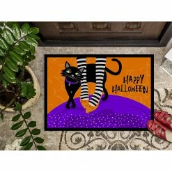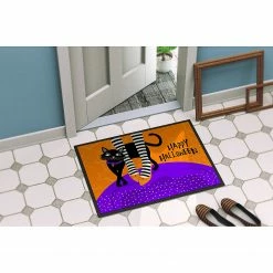 Halloween Witches Feet Indoor or Outdoor Mat 24×36. Celebrate Halloween with this Halloween Doormat. Welcome your family and friends with this Artwork mat in full color. This action backed mat with hold up in almost any weather condition. This door mat measures about 24 inches by 36 inches and has a black binding tape to hold it’s many layers together. The top layer is a polyester felt that is dyed with the image that you see on the mat. The next couple of layers give the mat stability and the bottom of the mat is rubber that has been stamped to help prevent slipping. To clean this mat, hose it off with a water hose or use a powerwasher. Do not use any cleaner that produces suds.