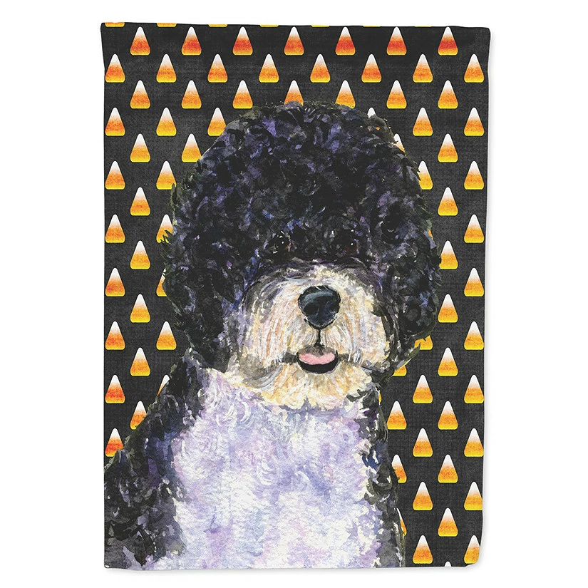 Portuguese Water Dog Candy Corn Halloween Portrait Flag Garden Size. Flag Garden Size featuring breed specific Portuguese Water Dog artwork. Celebrate Halloween with this Halloween Garden Flag. Artwork for your garden, patio or yard. This is a thick Double sided garden flag made from two pieces of polyester fabric. This 2 ply garden size flag is water resistant and weather proof. Words on the flag can be read correctly on both sides of the garden flag. Heavier than most other garden flags available. This flag will hold up in wind, rain and snow. Make your personal statement in your outdoor decor with this colorful quality garden flag. The flag measures approximately 11 1/4 inches x 15 1/2 inches. The flag has a 1 1/2 inch sleeve sewn in to allow you to attach the flag to any standard garden flag stand or garden size porch hanger. The garden stand is sold seperately. This Garden Flag is from Caroline’s Treasures Dogs category of products.