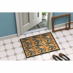 Watecolor Halloween Witches Hat Indoor or Outdoor Mat 24×36. Celebrate Halloween with this Halloween Doormat. Welcome your family and friends with this Artwork mat in full color. This action backed mat with hold up in almost any weather condition. This door mat measures about 24 inches by 36 inches and has a black binding tape to hold it’s many layers together. The top layer is a polyester felt that is dyed with the image that you see on the mat. The next couple of layers give the mat stability and the bottom of the mat is rubber that has been stamped to help prevent slipping. To clean this mat, hose it off with a water hose or use a powerwasher. Do not use any cleaner that produces suds. This Doormat is from Caroline’s Treasures Seasonal category of products.