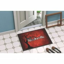 Welcome to Spooksville Halloween Indoor or Outdoor Mat 24×36. Celebrate Halloween with this Halloween Doormat. Welcome your family and friends with this Artwork mat in full color. This action backed mat with hold up in almost any weather condition. This door mat measures about 24 inches by 36 inches and has a black binding tape to hold it’s many layers together. The top layer is a polyester felt that is dyed with the image that you see on the mat. The next couple of layers give the mat stability and the bottom of the mat is rubber that has been stamped to help prevent slipping. To clean this mat, hose it off with a water hose or use a powerwasher. Do not use any cleaner that produces suds. This Doormat is from Caroline’s Treasures Seasonal category of products.