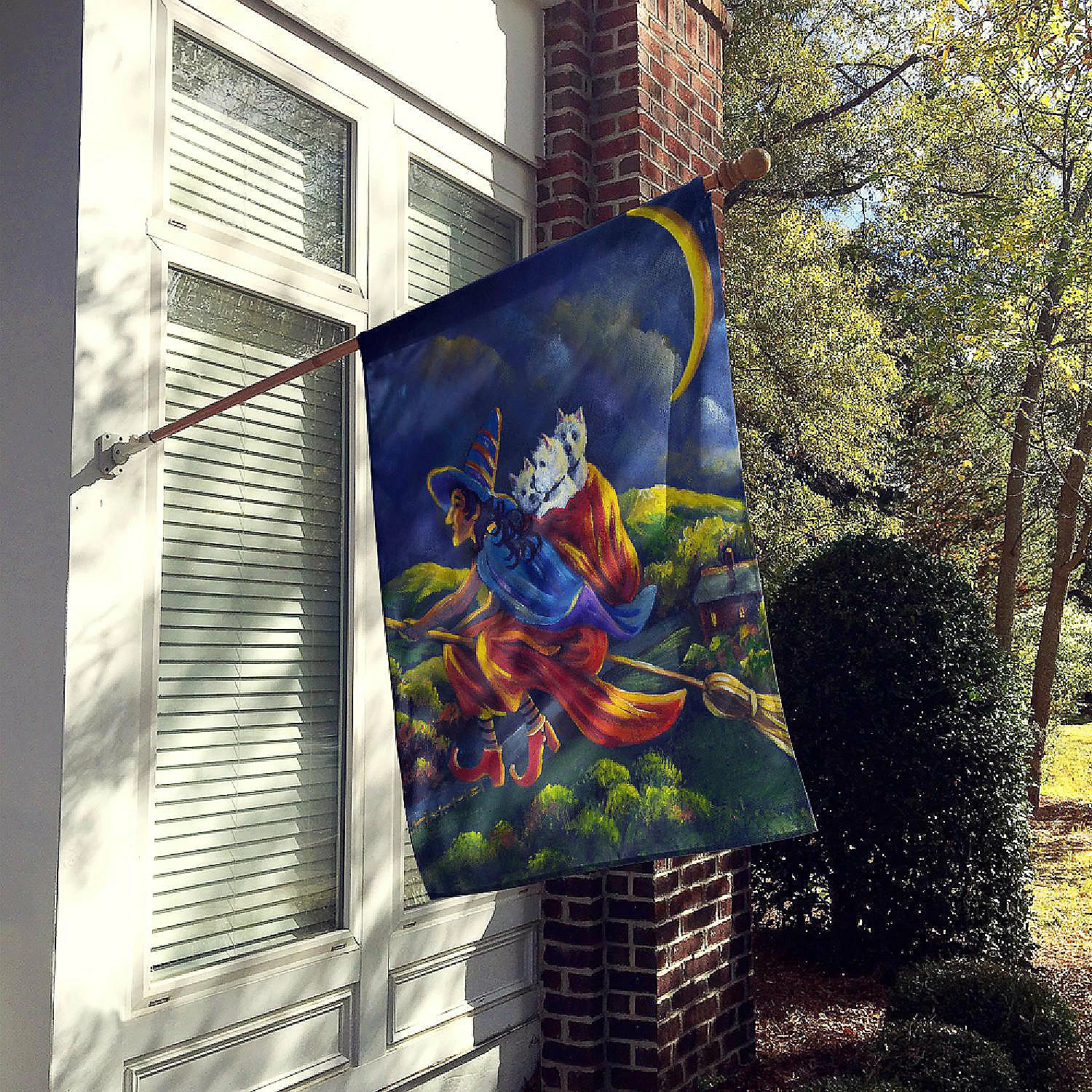 Westie Halloween Witch Flag Canvas House Size. Flag Canvas House Size featuring breed specific West Highland White Terrier artwork. Celebrate Halloween with this Halloween Large Flag. Heavy Duty Polyester House Size Decorative Sleeve Pole Flag. Each flag measures approximately 28 x 40 inches. This flag is sewn and made one at a time and may vary slightly in size. This is a sleeve pole flag that will fit a standard decorative flag pole. The flag pole and bracket are not included and should be purchased seperately. The flag is printed on both sides of the fabric with one side mirroring the other side. Each flag is printed in full color and they dyes are heat set for durability. This Large Flag is from Caroline’s Treasures Dogs category of products.