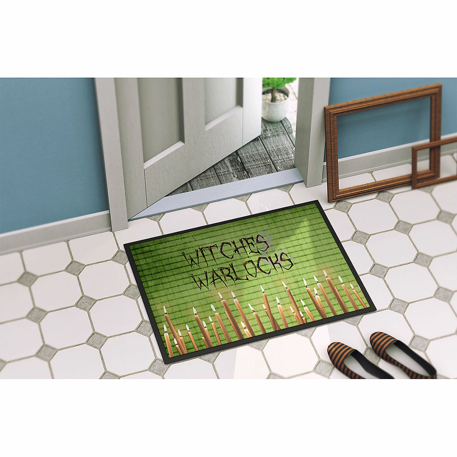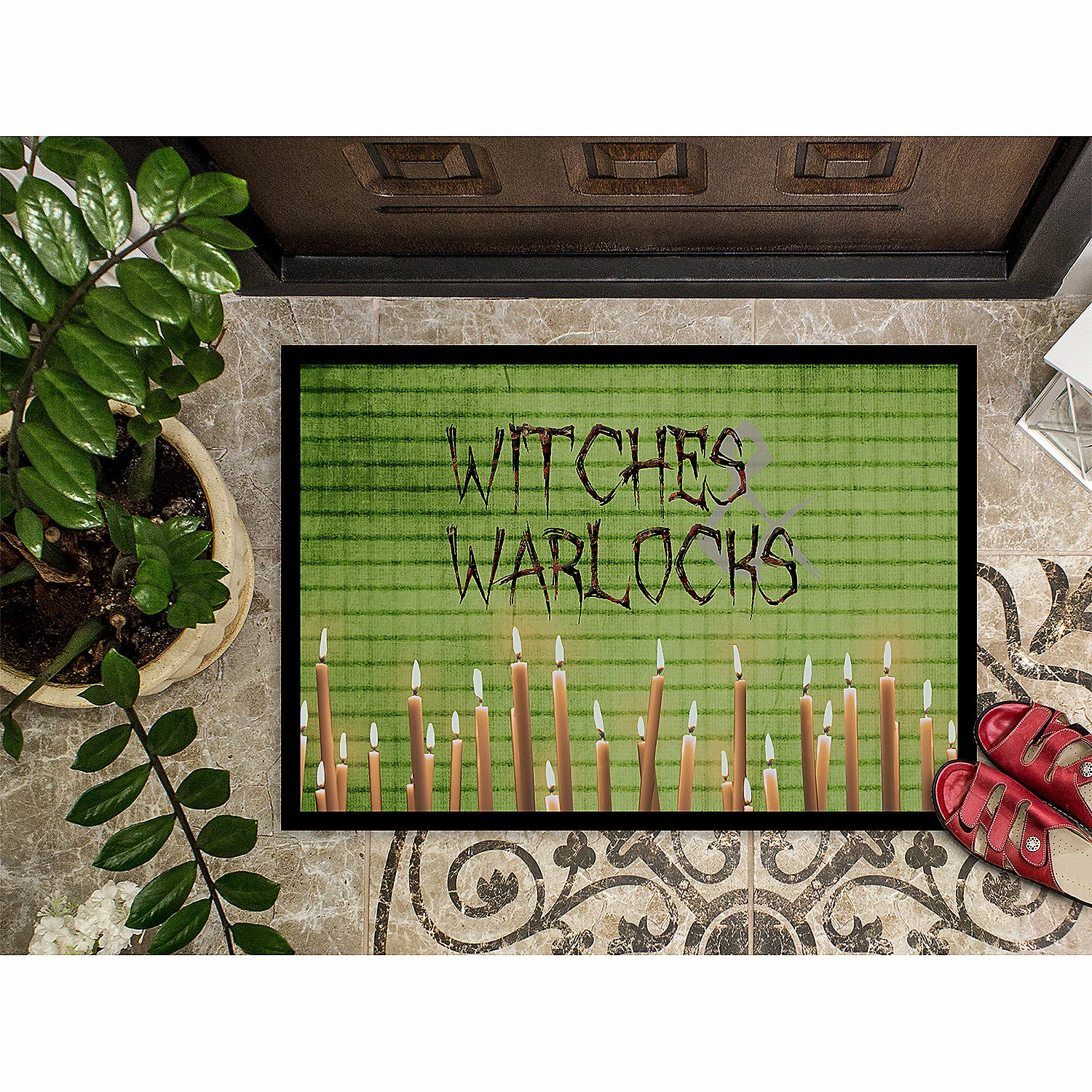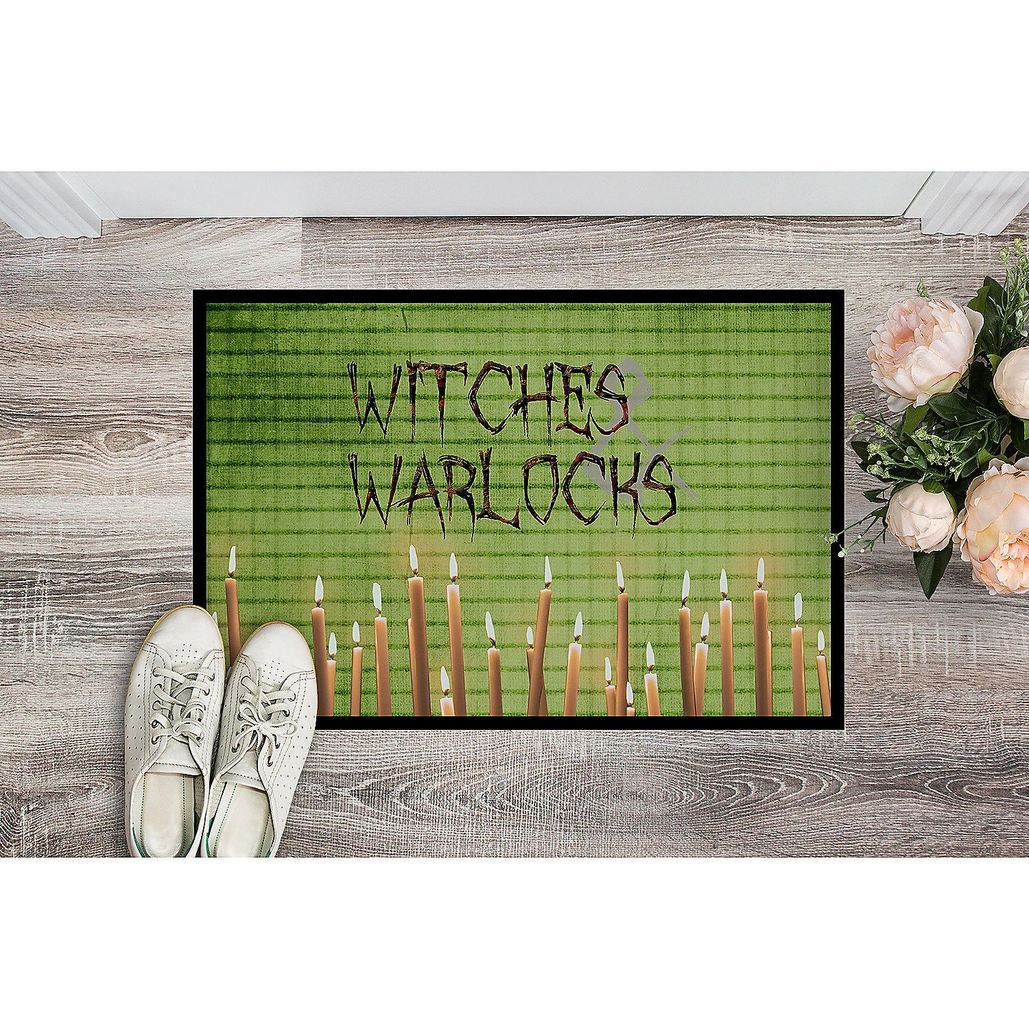 Witches and Warlocks Halloween Indoor or Outdoor Mat 24×36. Celebrate Halloween with this Halloween Doormat. Welcome your family and friends with this Artwork mat in full color. This action backed mat with hold up in almost any weather condition. This door mat measures about 24 inches by 36 inches and has a black binding tape to hold it’s many layers together. The top layer is a polyester felt that is dyed with the image that you see on the mat. The next couple of layers give the mat stability and the bottom of the mat is rubber that has been stamped to help prevent slipping. To clean this mat, hose it off with a water hose or use a powerwasher. Do not use any cleaner that produces suds. This Doormat is from Caroline’s Treasures Seasonal category of products.