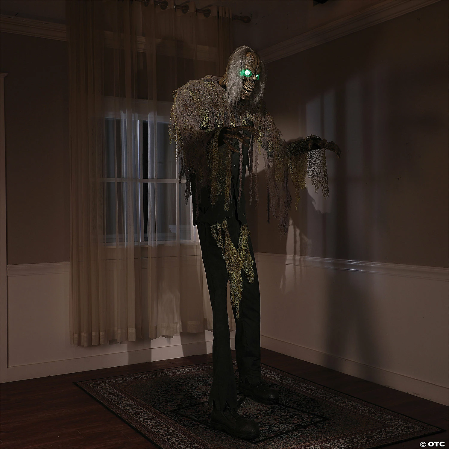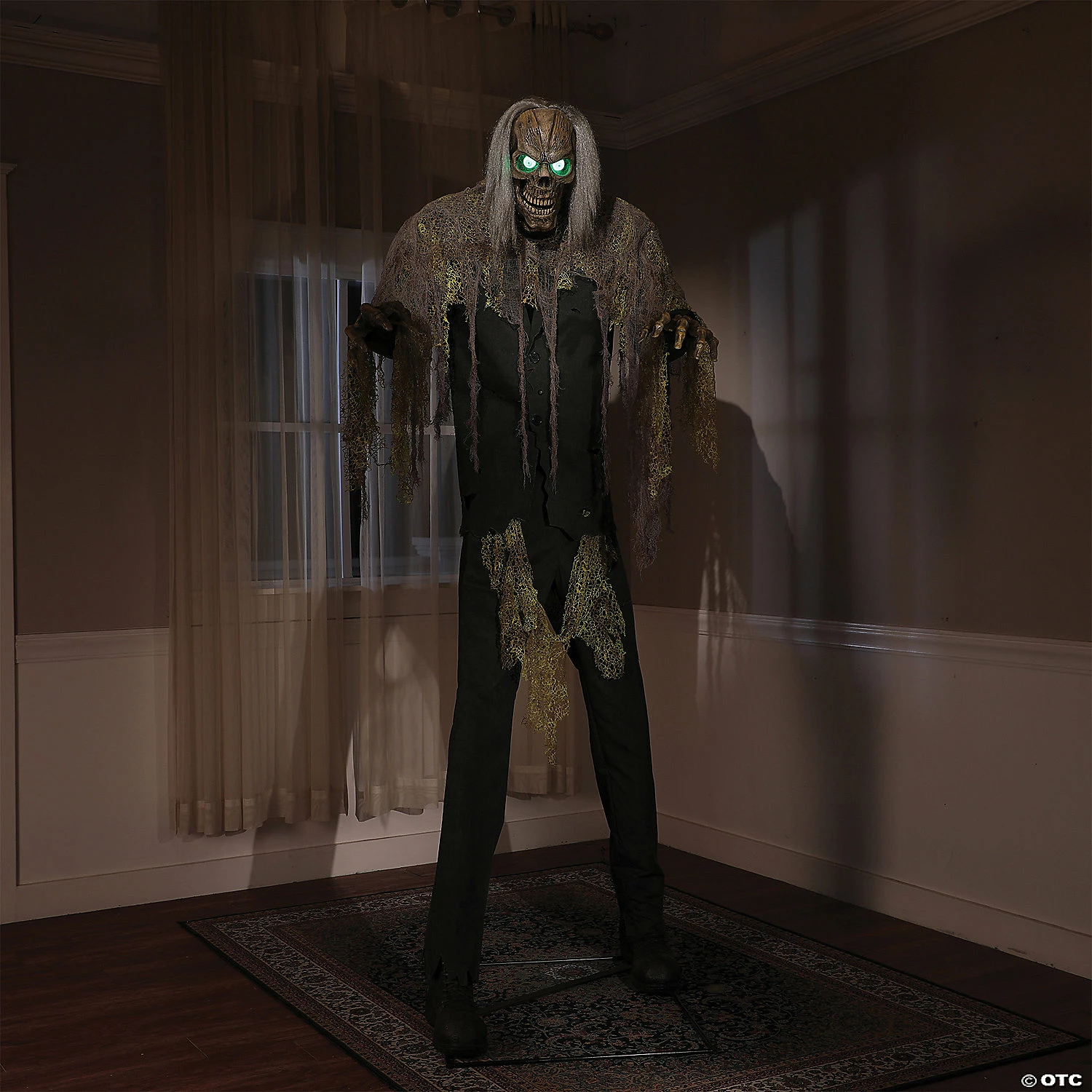 Lurking in the depths of your basement an undead terror awakens. The 7-foot Cellar Dweller Animated Prop covered in tattered rags has Glowing Green Eyes that pierce through the darkness, as his Head Turns and Mouth moves. His rough dry Voice speaks in a deathly tone as drips of water echo in the background. He speaks one of four scary phrases:Phrase #1: “This dank old house is oozing with foul stench of rotten souls. Its kept me thriving, as long as I hide down here with the rats. I’m happy to share with you, if you have the stomach for it! Huh huh huh!”Phrase #2: “Uuuuhhhh&hellip I ooze with the spirit of Halloween. Drip, drip drip it goes. Uuuuhhh&hellip”Phrase #3: “This place drips with doomed spirits. Released from their burial graves, they are searching for fresh victims to haunt. There is no way of hiding from them but go ahead and try! Huh huh”Phrase #4: “The syrupy, sick damp of the cellar has made me a moldy mess. But no matter. I’ve grown fond of the wet stench,and wantto share it with you! Uuuuhhhh!”His Arms also raise and lower, making his decrepit Boney Hands claw away at the darkness as an infrared sensor waits for the living to make a wrong move, activating his presence. Three activation options include, Steady-On, Infra-red Sensor, or Step-Here Pad. There is also a volume control so you can adjust to your surroundings. Constructed of durable metal rods that snap together, this piece is easily assembled in less than 30 minutes.The included Universal Adapter has 4 interchangeable plugs, and works in the USA, UK, Germany, and Australia.