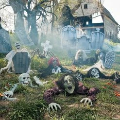 On the hunt for Halloween zombie decorations? Make your Halloween party come to life with this Clawing Zombie Groundbreaker with LED Eyes! This undead animated Halloween decoration appears to be breaking through the ground to join the living for some spooky fun! Set your Halloween scene or add to your haunted house for a frightful look! This zombie laughs as its eyes flash red. Latex and fabric. Requires 2 “AA” batteries, not included. Not motion-activated. 10″ x 25″