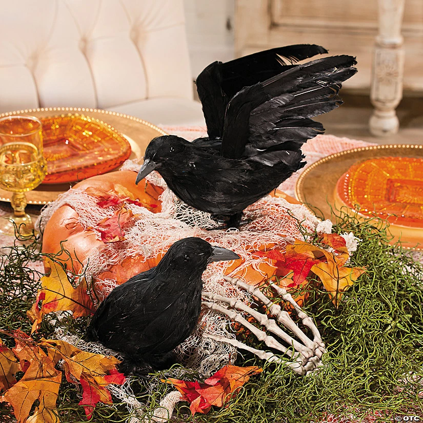Pop these Halloween props into your party centerpieces, place them on jack-o’-lanterns or perch them on your chandelier. They’re Halloween decorations that add classic, gothic mystery to your décor. Incredibly versatile and overlaid with genuine feathers, these creepy crows look like the real thing as they add a spooky touch to your fright night festivities. Freestanding in 2 poses. (2 pcs. per set) 10″ – 12″