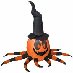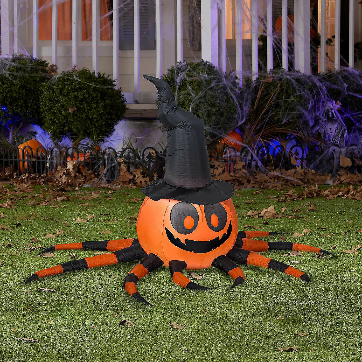 Celebrate Halloween with an Airblown® Inflatable spider! Styled with a jack-o’-lantern head, striped legs and witch hat, our orange and black spider inflatable makes a spooktacular addition to your Halloween decorations. Setup is super simple. Just plug it in, stake it down and watch the magic unfold. Display this Halloween inflatable as a standalone or combine it with other Airblown Inflatables to create a custom scene. Perfect for indoor or outdoor Halloween parties.