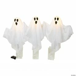 Light the way to your boo-tiful home! These yard stakes are great outdoor Halloween decorations. Let these three shrouded ghosts help trick-or-treaters follow the path to your treats, or use the ghosts as Halloween decoration that’s not so scary. Leave the lights on or switch the lights to twinkle to add to the ghostly look of this specter trio. Polyester with plastic. (3 pcs. per set) 20″ Requires 3 “AA” batteries, not included.