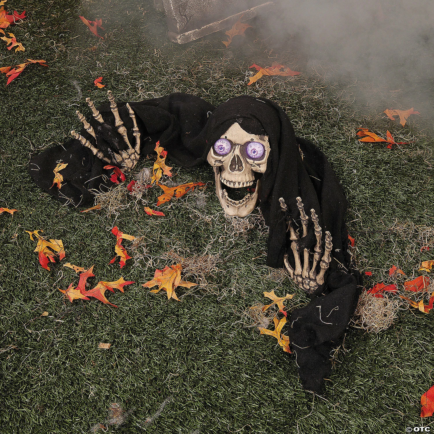 LED Skeleton Ground Breaker. Add this Halloween outdoor decoration to your yard just in time to surprise trick-or-treaters! Its wide, bulging eyes light up in an assortment of different colors. Hands include metal stakes for secure ground placement. Plastic. 18″ Requires 2 “AA” batteries, not included.