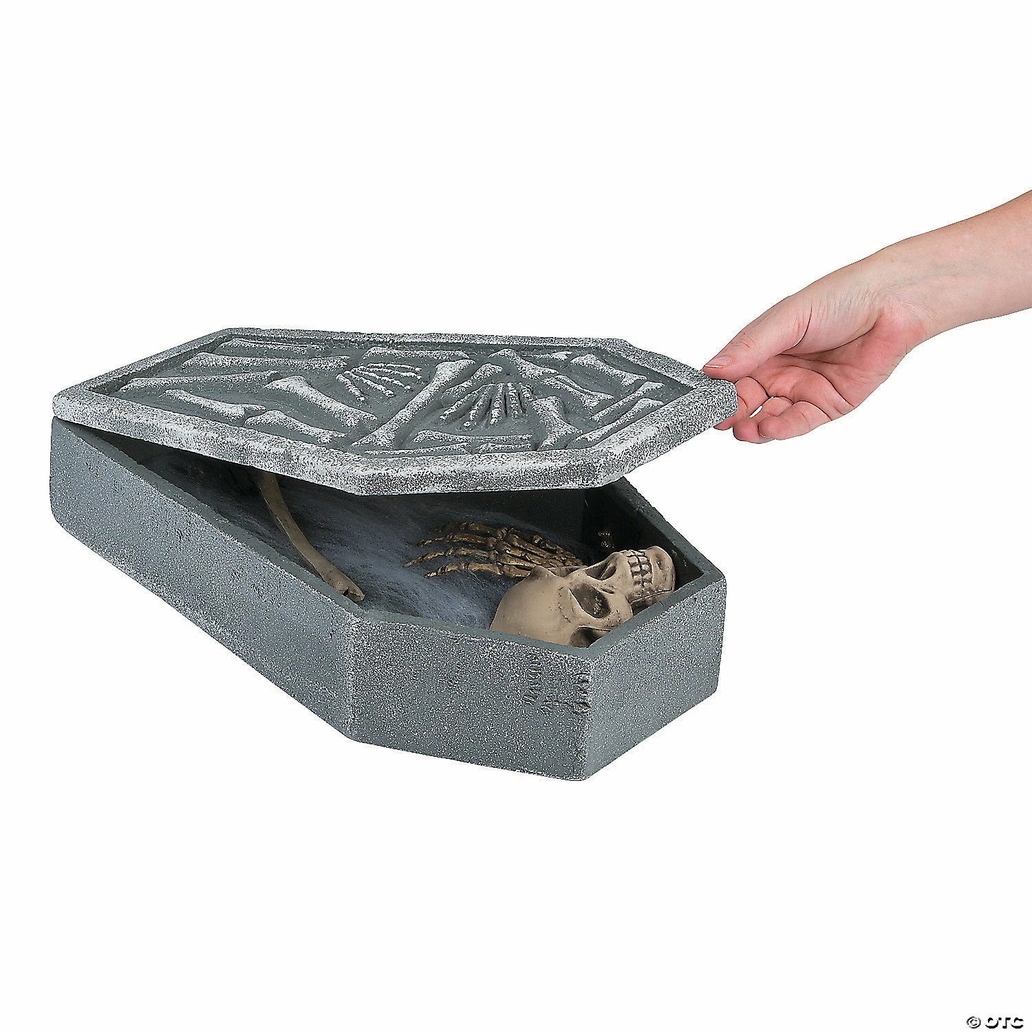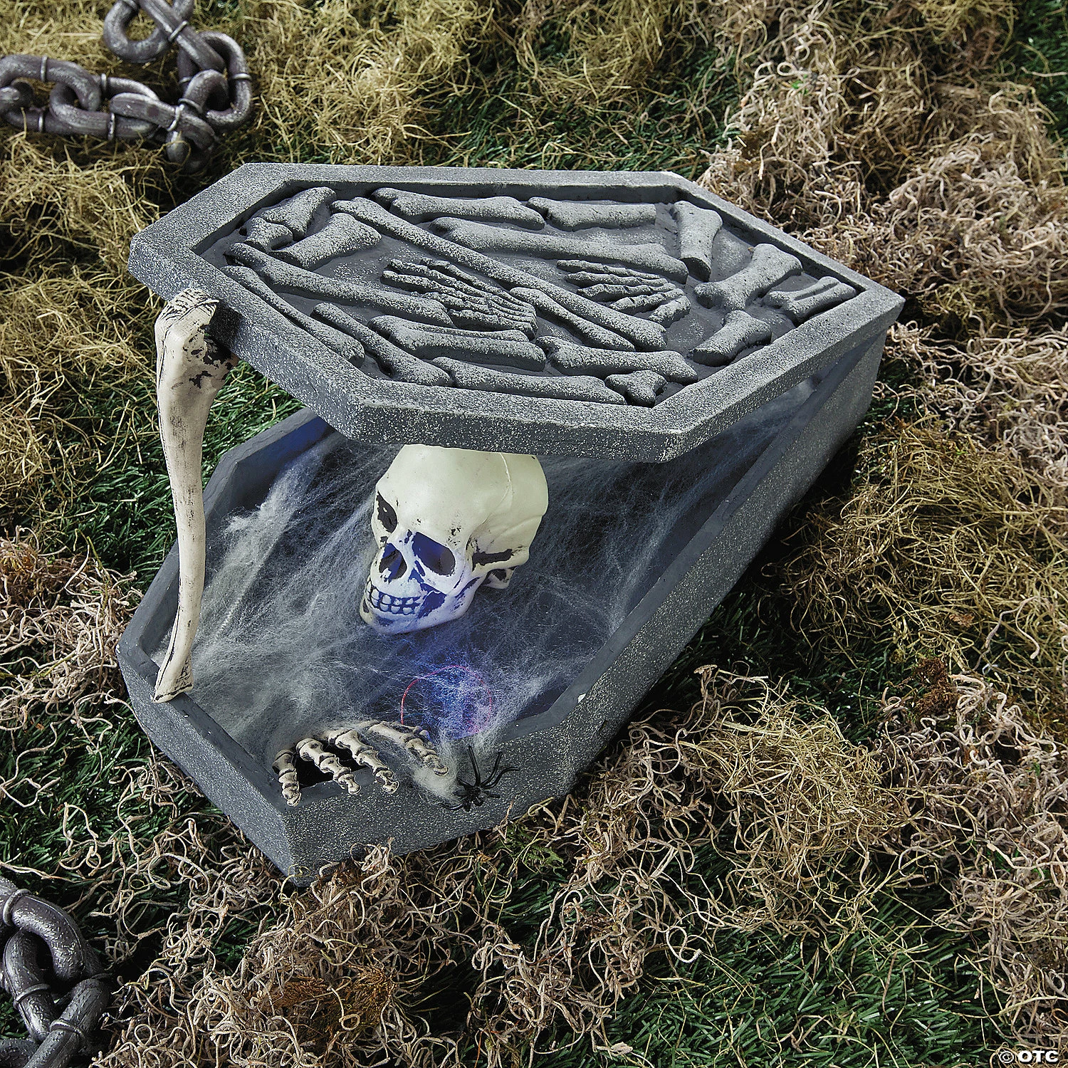 Like something straight out of a Halloween graveyard, this LED Skull in Coffin is sure to add some fright to your Halloween night. Use this cemetery decoration as part of your Halloween house decorations. Use this Skull in Coffin as decor for your Halloween party or scare and entertain trick-or-treaters as they approach your home. Place indoors or outdoors for a frightfully fun Halloween! LED Skull In Coffin. Green, blue and red bulbs light up the plastic skull. Foam. 16 1/2″ Batteries included.