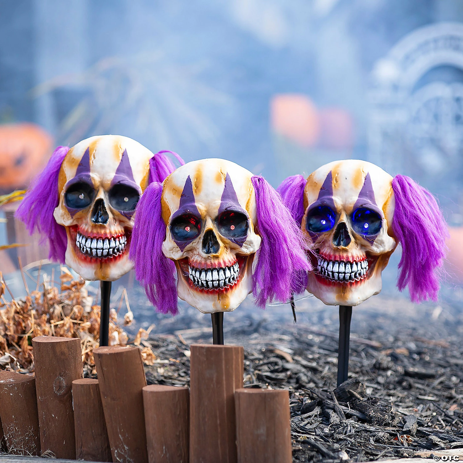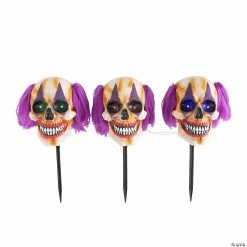 Terrify trick-or-treaters, neighbors and other passers-by with these Halloween yard decorations that light up when you walk by. Featuring ghastly clown faces and motion-activated sensors that set off flashing lights in their eyes, this yard décor is not for the faint of heart. You’re a shoe-in for scariest house on the block with these lights on display! Plastic. (3 pcs. per set) 7″ Requires 3 “AAA” batteries, not included.