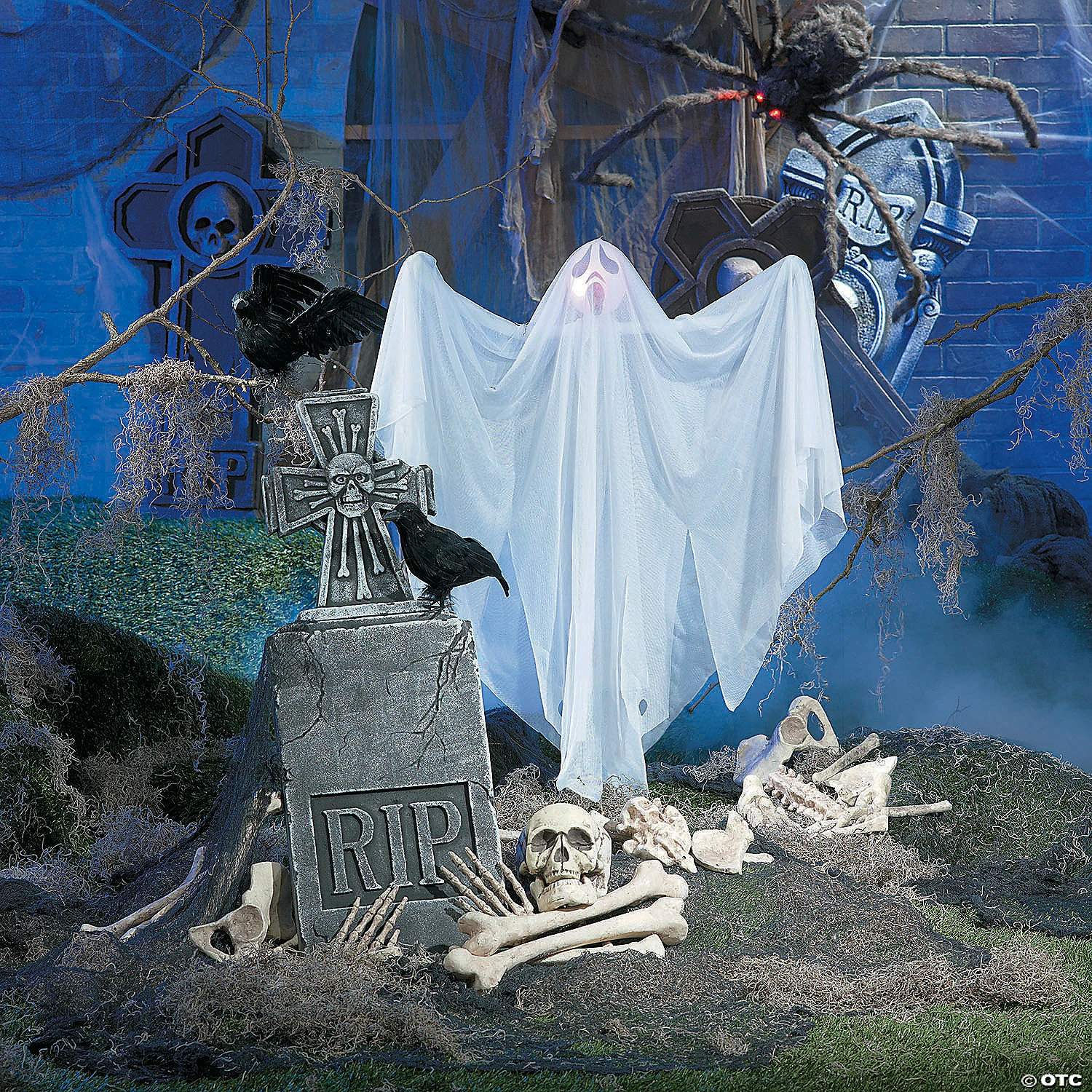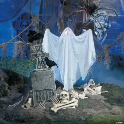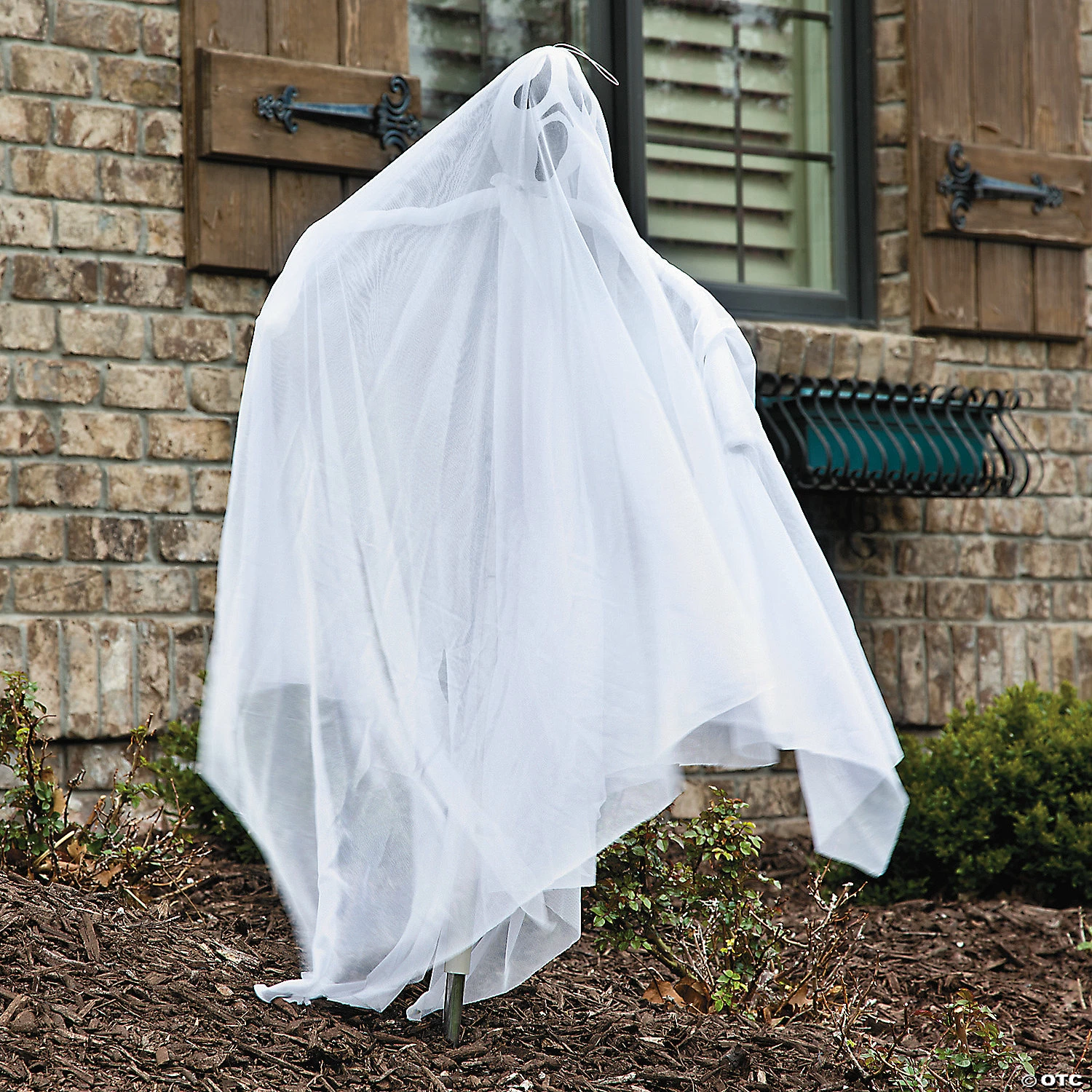 A colorfully-chilling Halloween prop! Guide guests to your Halloween party with this fall outdoor décor. Sure to add an eerie look to your lawn, this eerie spirit is perfect for greeting trick-or-treaters or decorating the entrance to a haunted house. The head of this traditional white ghost lights up with changing colors. Comes on a 41″ plastic stake with metal base. Batteries included. Simple assembly required.