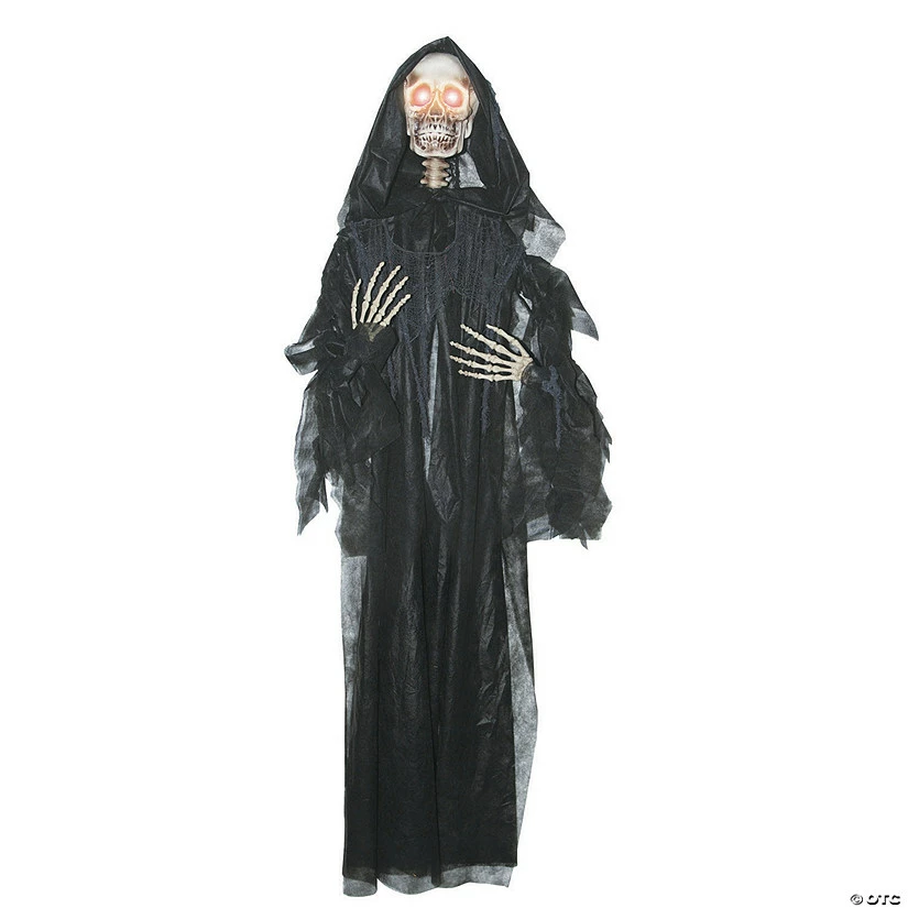 Death to bad Halloween party planning comes knocking with this hanging reaper. Perfect for your DIY haunted house and Halloween party, this scary grim reaper has light-up eyes that are sure to send shivers down everyone’s spine. 63″ x 7″ x 63″. Requires 3 AG watch batteries (not included). Special Shipping Information: This item ships separately from other items in your order.