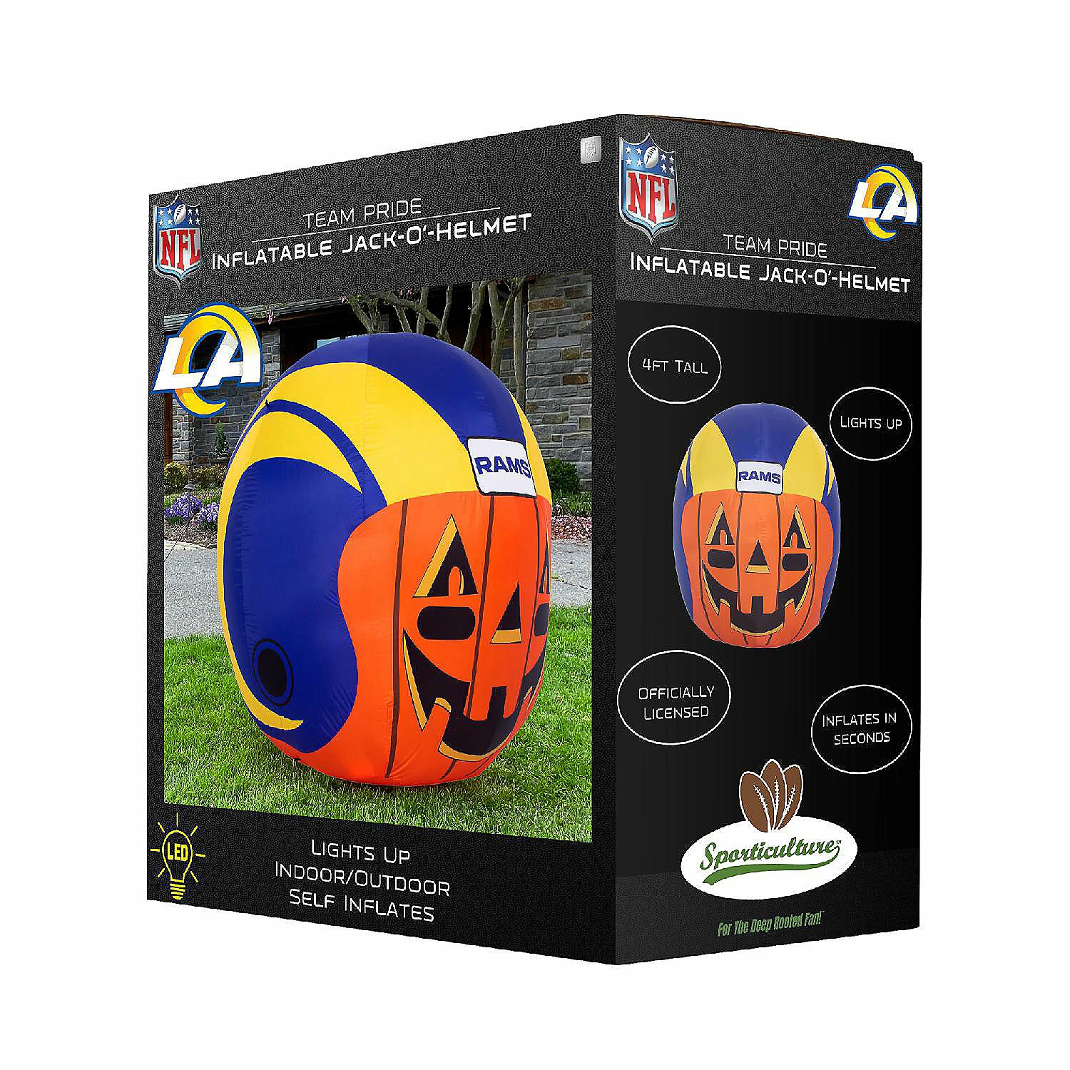 Get ready for fall, football and inflatable fun with the Team Pride Inflatable Jack-O’-Helmet! This four foot officially licensed pumpkin with jack-o’-lantern face and logo graphic helmet inflates in seconds, illuminates with internal LED lights, and deflates for easy storage. Made of durable weatherproof material, it’s the perfect addition to a front yard Teamscape and Halloween décor. Complete with tie down ropes and stakes, you are sure to be the envy of the neighborhood all season long! Makes the perfect gift For The Deep Rooted Fan!