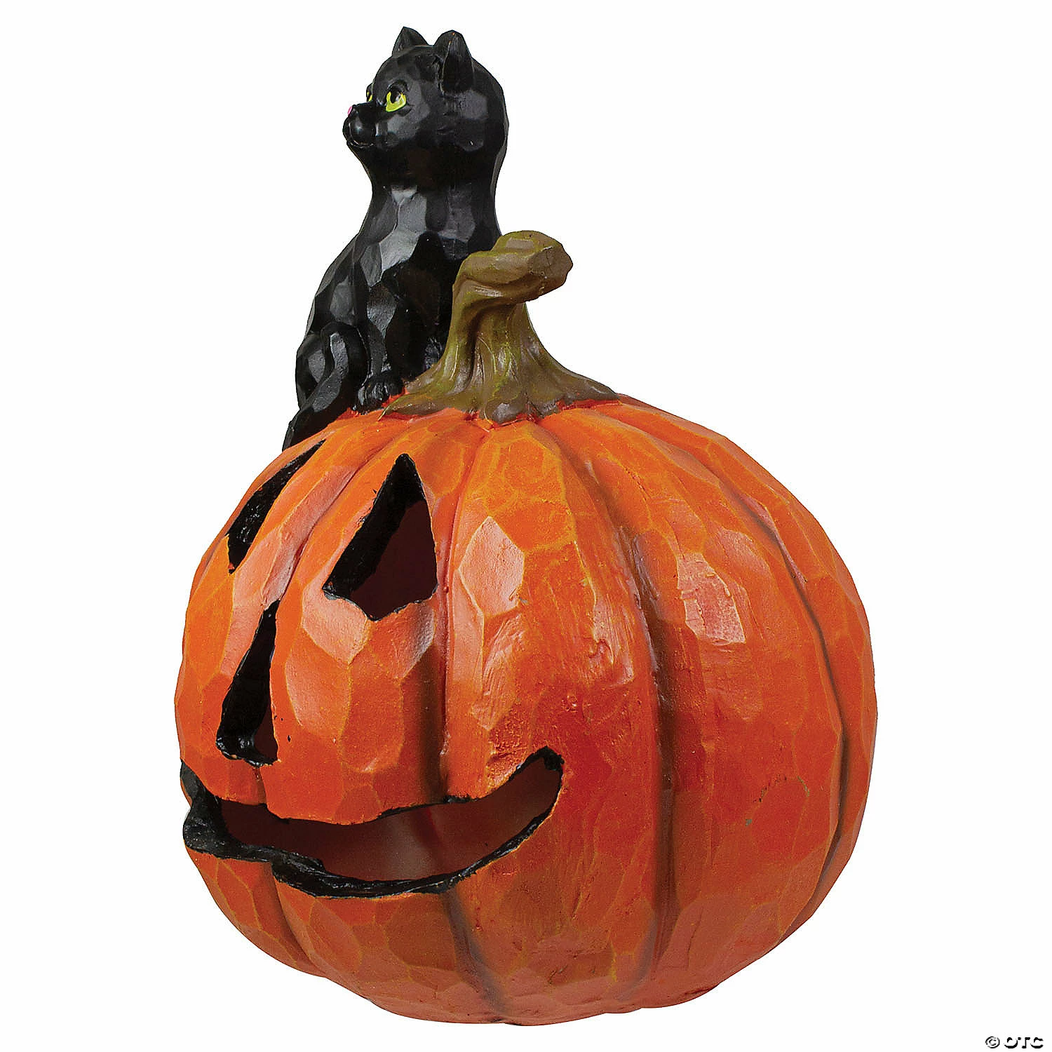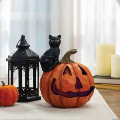 Two of the most iconic symbols of Halloween come together as one in this fantastic depiction. A little black cat gazing up sitting atop the spooky smiling pumpkin face. Celebrate Halloween this year with this light-up jack-o-lantern and black cat tabletop statue! Features: Halloween jack-o-lantern and black cat tabletop decoration Black cat sitting on top of an orange jack-o-lantern Scary smiling jack-o-lantern face Illuminated from the inside by a color changing LED light Hand crafted and painted-slight variations may occur Requires (3) “LR41” button cell batteries – included Dimensions:10″H x 7.5″W x 7.5″D Material(s):polystone- resin mixed with powdered stone additives to give a stone-like finish