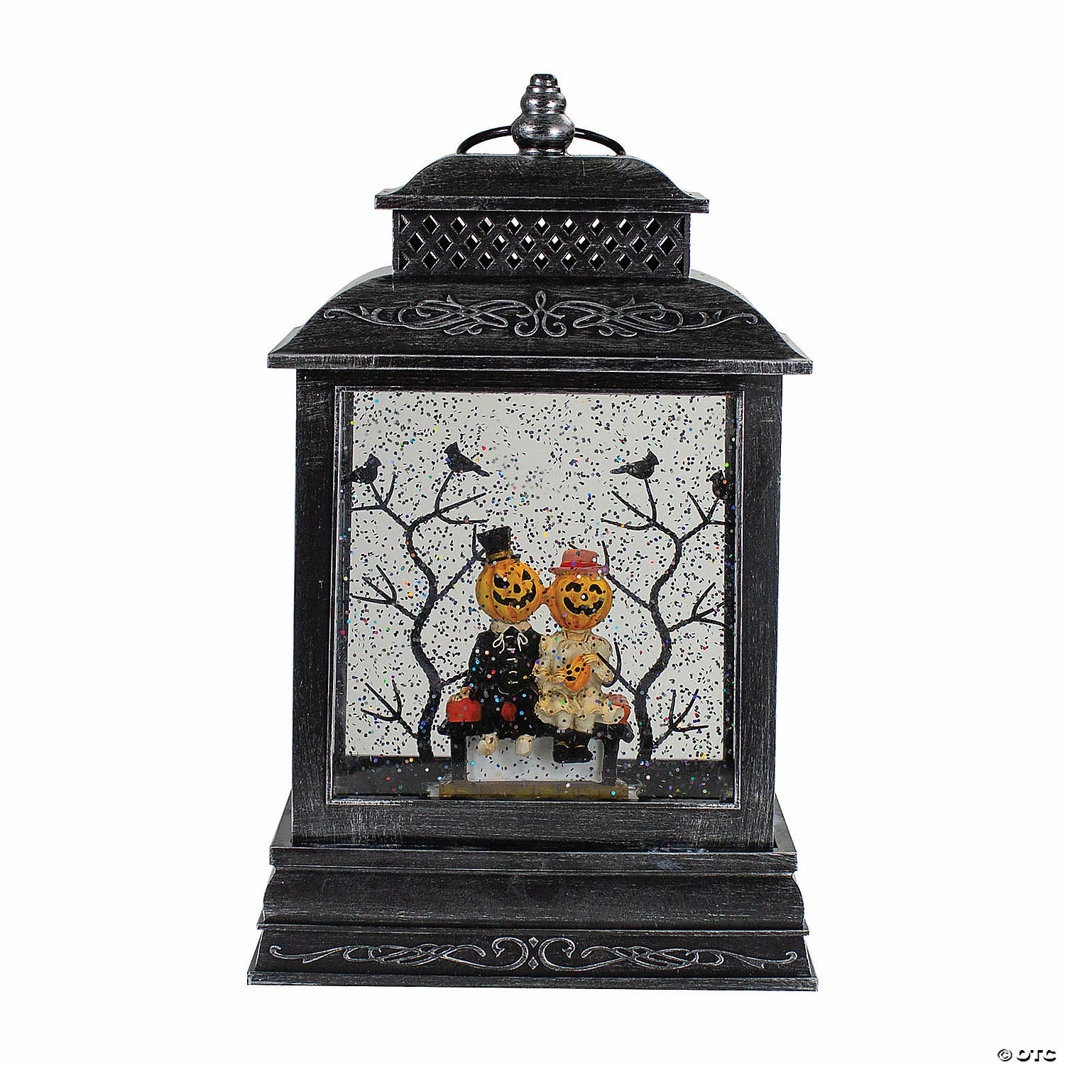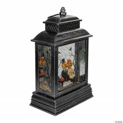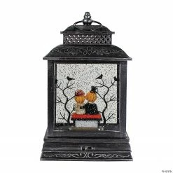 This unique lantern snow globe would be the perfect addition to your home for the Halloween season. Simply turn it on and watch it come to life. This black lantern has a distressed finish and is illuminated from within by a warm white LED light. It features a motor that moves the water and glitter around creating a snowy glitter scene. Perfect to place on any tabletop in your home. Features: Battery operated black Halloween lantern. Features a jack-o-lantern couple sitting on a bench with spooky Halloween trees behind them. The inside is illuminated from the top by a warm white LED light. A motor pushes the water and glitter around the snow globe. Requires 3 “AA” batteries – not included. Convenient on/off switch at the side. For indoor use only. Dimensions: 11.5″H x 6.75″W x 3.75″D. Material(s): plastic/plexiglass/resin/metalSpecial Shipping Information: This item ships separately from other items in your order. This item cannot ship to a P.O. Box. This item may be subject to additional processing days.ITEM IS NOT ELIGIBLE FOR EXPEDITED SHIPPING”