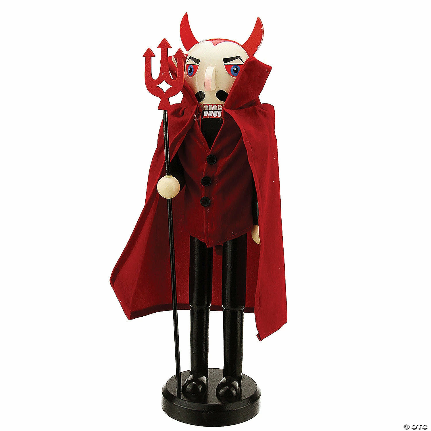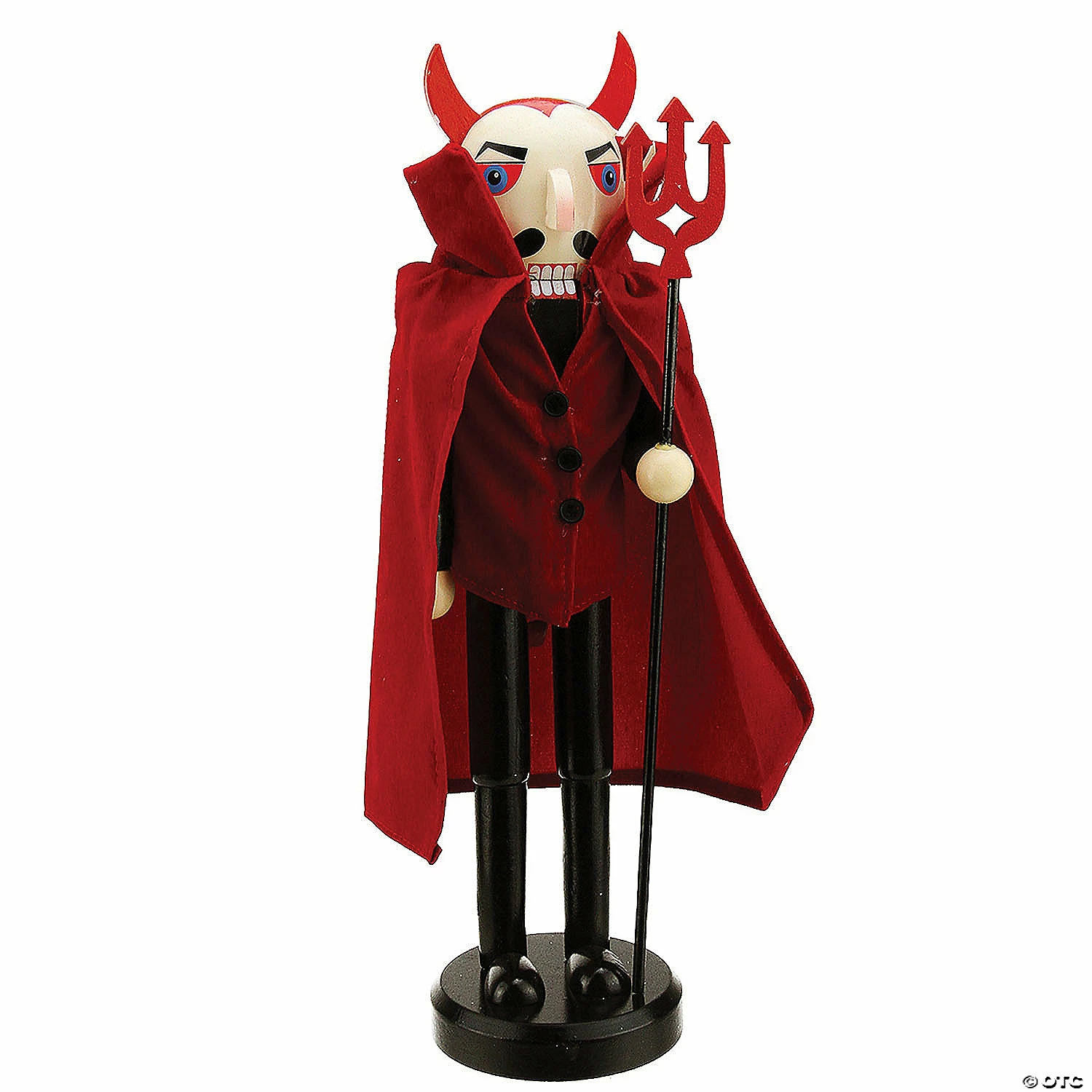 Add a creepy twist to your holiday decor with this Devil Nutcracker. The perfect addition to your Halloween decor. Ideal for tabletops mantles and desks. or as a gift for your dearest friend. Product Features: Devil holding a pitch fork Halloween nutcracker Wearing a red button-down vest and cloak with black pants He holds pitchfork with red devil horns Stands on an attached and sturdy black base Mouth opens and closes with lever Recommended for indoor decorative use only Dimensions: 14″H x 4″W x 3.5″D Material(s): wood/fabric