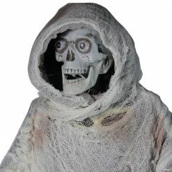 Create a horrifying display this Halloween with this dreadful skeleton. It will fit in wonderfully with the horrific atmosphere. A perfect addition to any haunted house or as part of your home and office decorations!. Product Features: Looks very scary with a tattered and torn distressed brown hooded robe. Eyes flash with cool white lights and head rotates when touched. Touch also activates spooky sounds. Comes with a stand- some easy assembly required. Requires (3) AA batteries- not included. Dimensions: 65″H x 30″W x 16″D. Material(s): fabric/plastic/metal Special Shipping Information: This item ships separately from other items in your order. This item cannot ship to a P.O. Box. This item may be subject to additional processing days. ITEM IS NOT ELIGIBLE FOR EXPEDITED SHIPPING