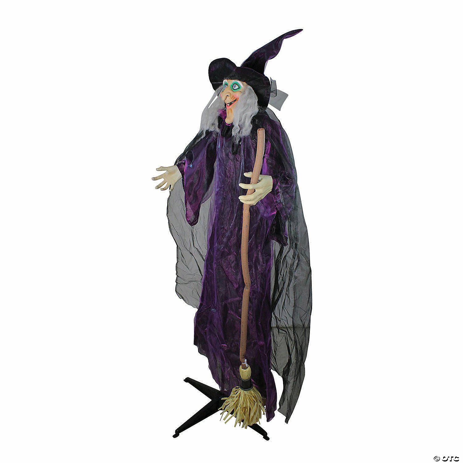 This touch-activated standing witch will scare anyone who sees it in your Halloween decor. You can create your own spooky graveyard and it’s lighting effect will make it the perfect accent piece for your Halloween decor. A great addition to any haunted house or as part of your home and office decorations! . Features: Witch is wearing a purple robe and hat. Holding a broomstick. Witch comes to life when touched above the arms. Eyes flash with cool white lights. Witch moves from side to side as she cackles and talks. Comes with a stand – some easy assembly required. Requires (3) “AA” batteries- not included. Recommended for indoor use. Dimensions: 66″H x 29″W x 17″D. Material(s): fabric/plastic/foam/wire Special Shipping Information: This item ships separately from other items in your order. This item cannot ship to a P.O. Box. This item may be subject to additional processing days. ITEM IS NOT ELIGIBLE FOR EXPEDITED SHIPPING