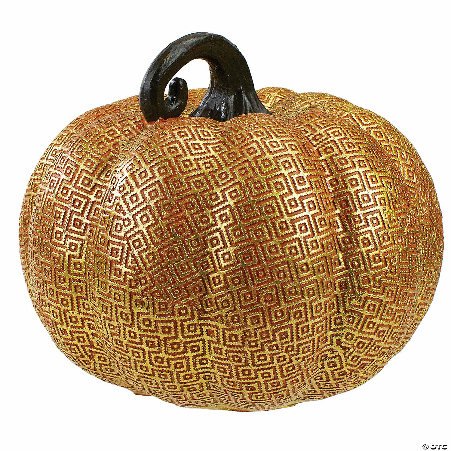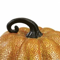 Accent your home this fall with our beautiful orange and gold pumpkin! It comes with a unique ornate design that features orange on the inside of the pattern and gold on the outside. This versatile pumpkin is perfect for displaying on Thanksgiving or Halloween. Features: Orange and gold pumpkin decoration Short curved black stem Ornate textured design Can be placed virtually anywhere with a flat surface Made with durable resin for years of enjoyment Recommended for indoor use only Dimensions: 6.25″H x 7.5″W x 7.5″D Material(s): resin
