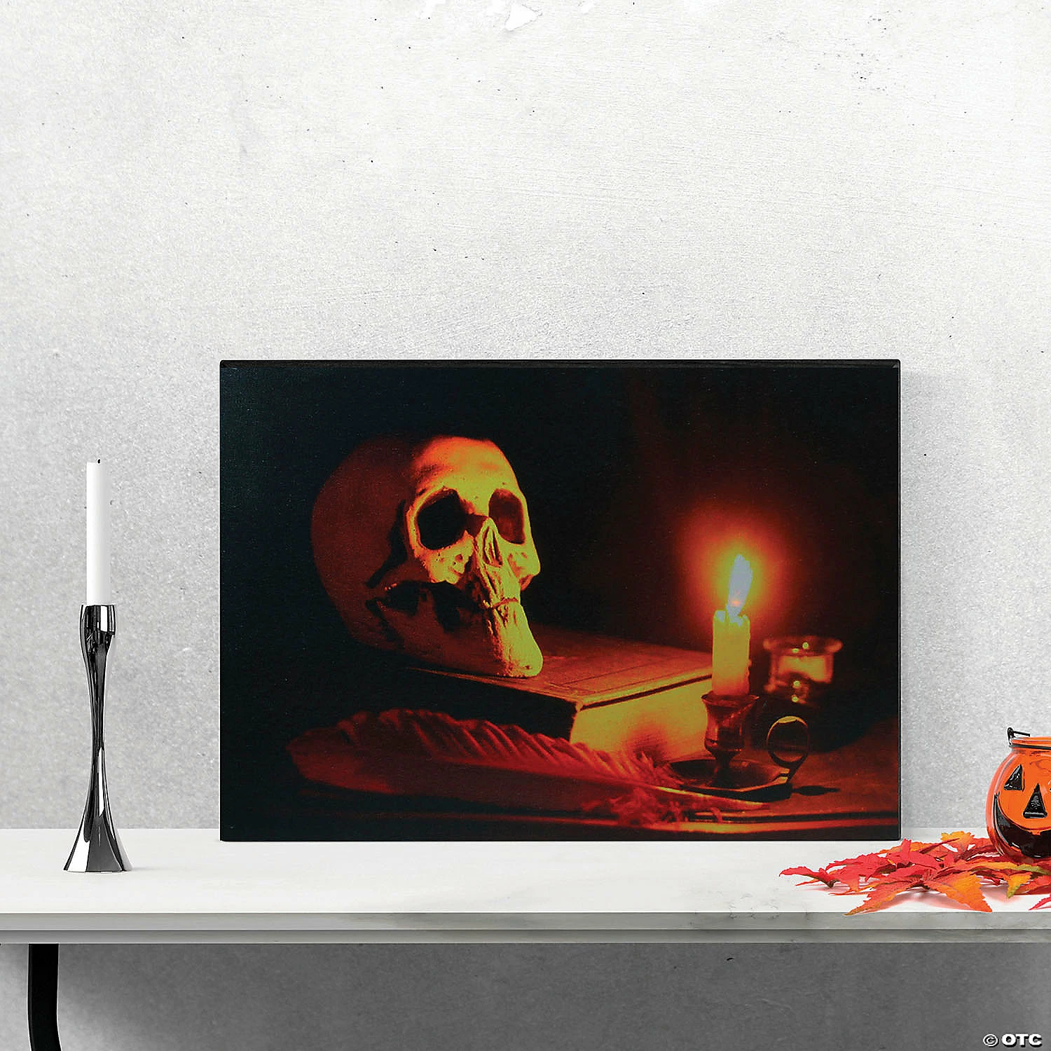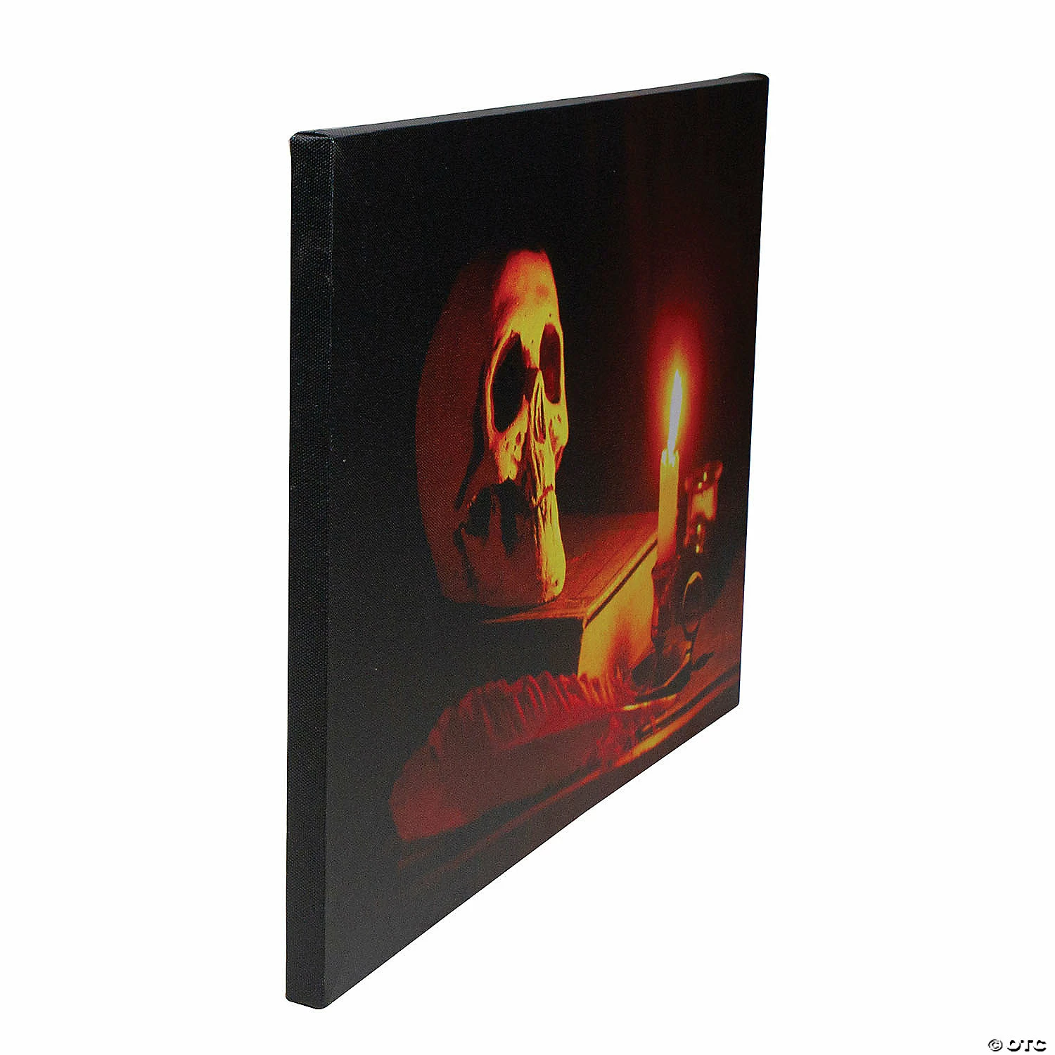 Add an artistic twist to your Halloween night! This spooky wall art will leave your friends in shock. The antique candle lighting up a skull holder will be an epic display that will blow their minds off! It incites a lot of thrill and mystery. Product Features: Skull set upon a book being illuminated by a single candle set in an antique candle holder Illuminated by a single flickering amber LED light located on the candlewick Comes ready-to-hang with a hook on the back Convenient on/off switch on the side Recommended for indoor use only Dimensions: 12″H x 15.75″W x 0.5″D Material(s): canvas/plastic/MDF Note: requires (2) AA batteries – not included