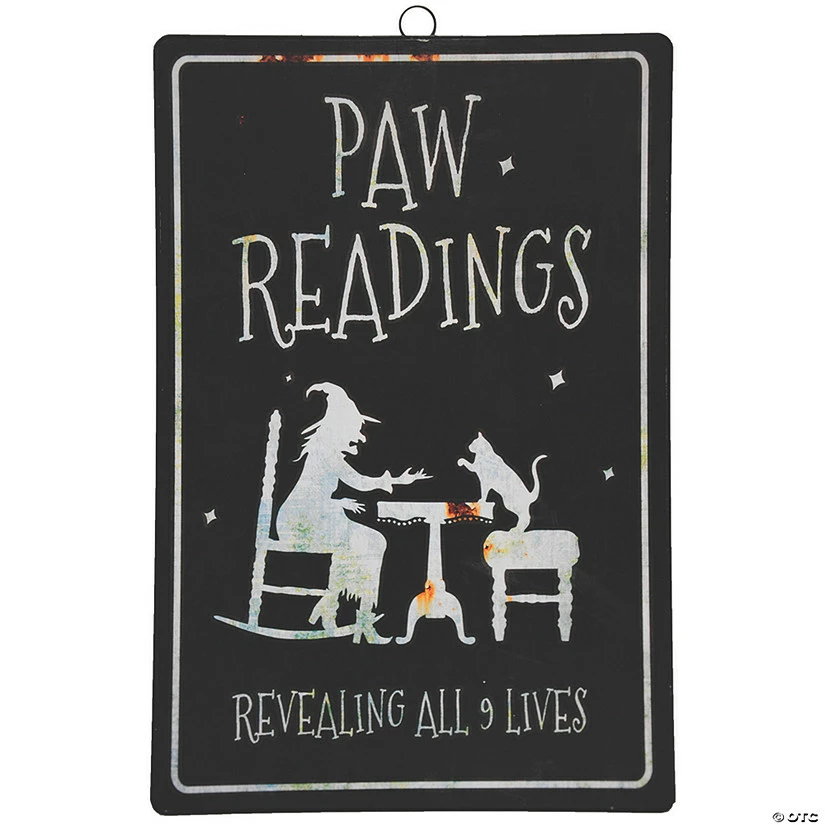 Don’t be a Scaredy-Cat when you see this hanging sign. Stop by for a reading with this Psychic Witch- We predict she will reveal a bright future! This funny cat inspired sign is the perfect addition to your Halloween home décor. The Paw Readings Revealing All 9 Lives Sign features a black metal sign with a printed image of a witch and cat with the words “Paw Readings Revealing All 9 Lives”. The metal sign has a hook on back for easy hanging. Measures 17” L x 11” W.Special Shipping Information: This item ships separately from other items in your order. This item cannot ship to a P.O. Box. This item may be subject to additional processing days.ITEM IS NOT ELIGIBLE FOR EXPEDITED SHIPPING