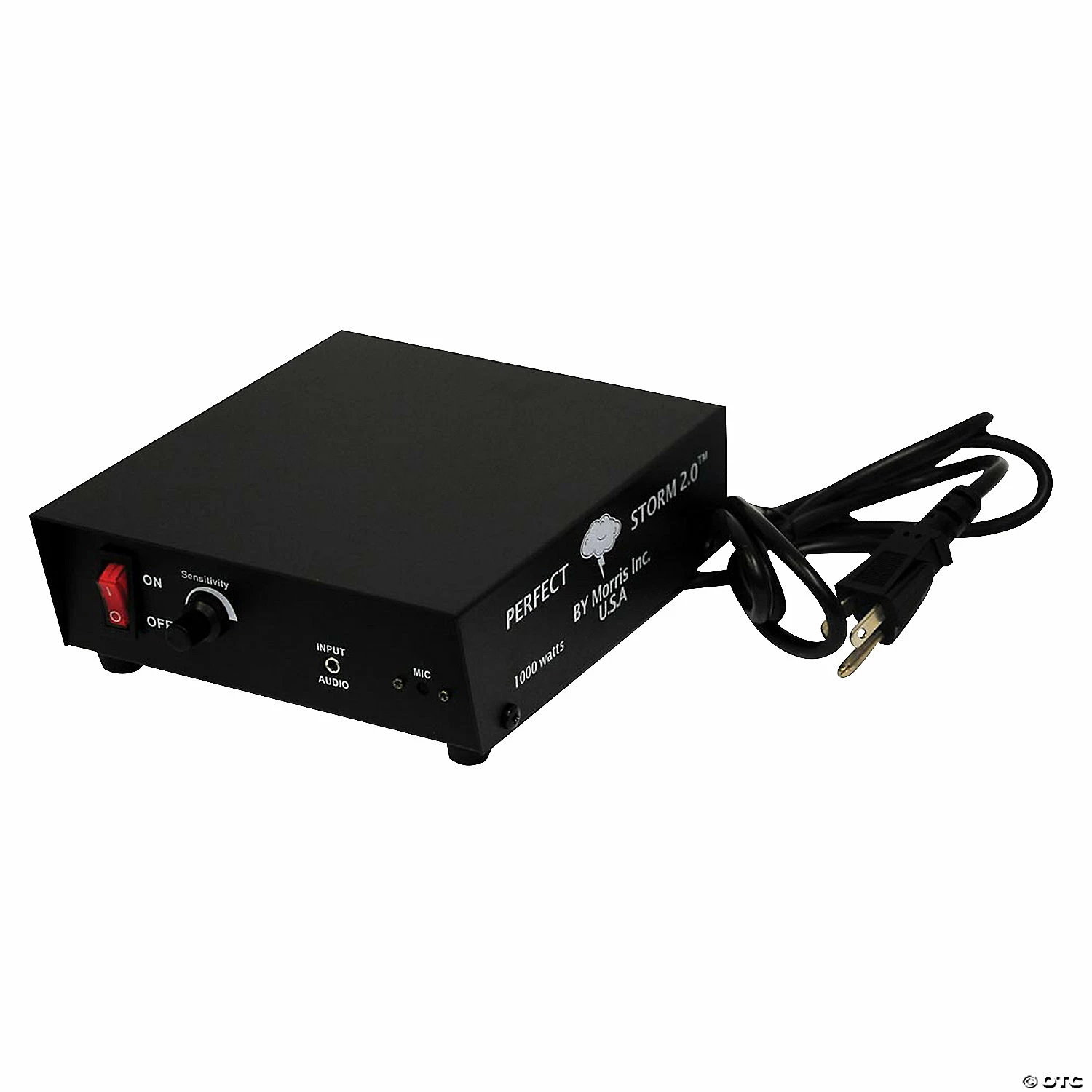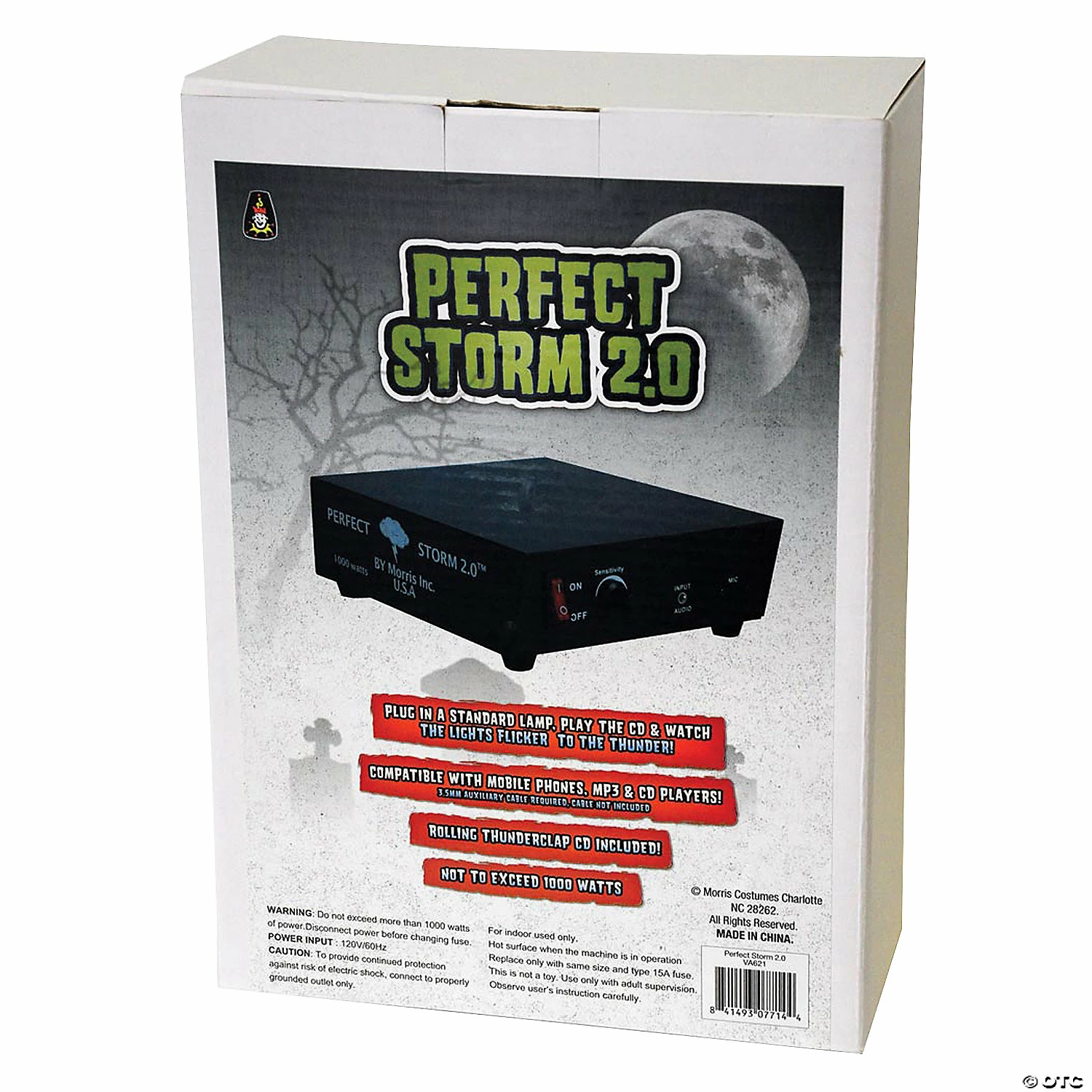 Perfect Storm is a sound-activated device that allows you to control the on and off flashing of lights when the thunder sound from the CD supplied is played. This makes for great thunderstorm effects for your haunted house or home haunt/Halloween party. Simply play the CD provided with the unit with your lights plugged into the back of the Perfect Storm Box (which can be plugged into any 15 amp. 120 volt outlet). Please note that total lights used should not exceed 1000 watts of power or a reset fuse in the back of the unti will trip. If this happens reduce lights used and hit reset button on back of unit. Besides using CD you can also place whatever sound effect you wish into your tape player MP3 player smart phone etc and either place one of your stereo speakers near or in front of the Perfect Storm unit or connect the player audio line out (the proper jack cable may be needed, and is not included) to the Perfect Storm audio input jack. Using either of these two ways, when thunder is heard, lights will flash in synchronized fashion. Includes CD with over one hour of sound effects, CD player not included. Power input 120v/60 hz. Uses type 15A fuse. AC jack and audio jack. Round sensor knob on front of unit is adjustable to make lights flash to your liking. The Perfect Storm will work with a variety of different types of lights in including both incandescent and LED. (Not recommended for flourescent lights). For indoor use only. User instructions included.