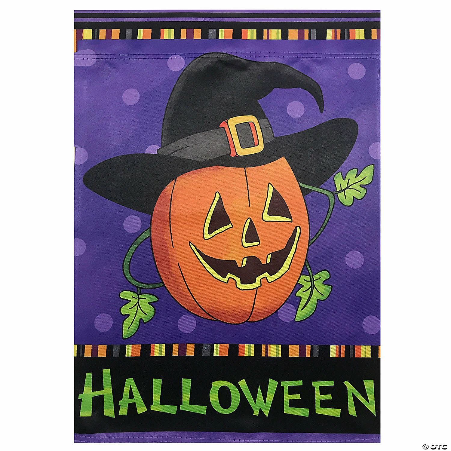 Display your love of the Halloween season with this happy jack-o-lantern Halloween flag! Showing the classic symbols of the season this flag is the perfect addition to your fall decor. Hang this on your house and everyone will know where the fun festivities are! Features: Halloween pumpkin house flag. Smiling jack-o-lantern in a witch hat. Halloween written in green across the black bottom. Purple polka-dotted background. Halloween written across the bottom of the flag. Features a soft high-quality fabric for durability. Sleeve on top allows the flag to slide onto the flagpole. Design is on both sides. Care instructions: Hand wash in cold water with mild soap. Hang dry. Use cool iron if needed. Dimensions: 12.5″ wide x 18″ long. Material(s): polyester. Note: Flagpole is not included Special Shipping Information: This item ships separately from other items in your order. This item cannot ship to a P.O. Box. This item may be subject to additional processing days. Item is not eligible for expedited shipping. You may initiate a return for unused items within 30 days, if the items are in original packaging with all original materials included with the shipment.