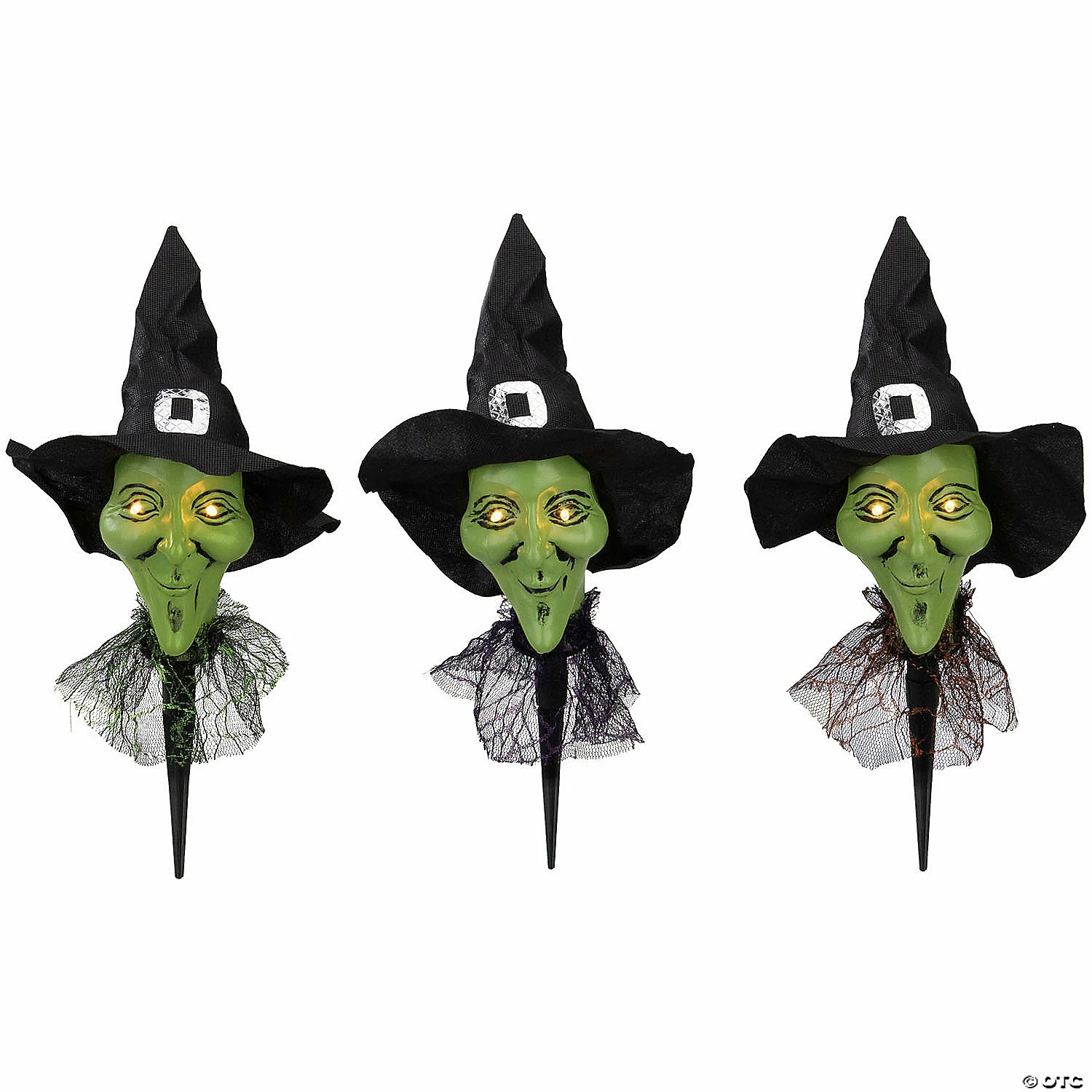It’s the spookiest time of the year. Make sure your Halloween decorations are the talk of the neighborhood this year. These witch head pathway markers are perfect for leading trick-or-treaters to your front door. Product Features: Color: clear bulbs/black wire. Total number of bulbs: 3. Bulb size: mini. 8 hour timer function. 16″ lead cord. Requires 3 ‘AA’ batteries – not included. Comes with (3) black ground stakes. Witches have orange green or purple lace neck pieces. Recommended for outdoor use. Dimensions: 16″ x 28″W x 4″D. Material(s): plastic/glass bulbs/wire Special Shipping Information: This item ships separately from other items in your order. This item cannot ship to a P.O. Box. This item may be subject to additional processing days. Item is not eligible for expedited shipping. You may initiate a return for unused items within 30 days, if the items are in original packaging with all original materials included with the shipment.