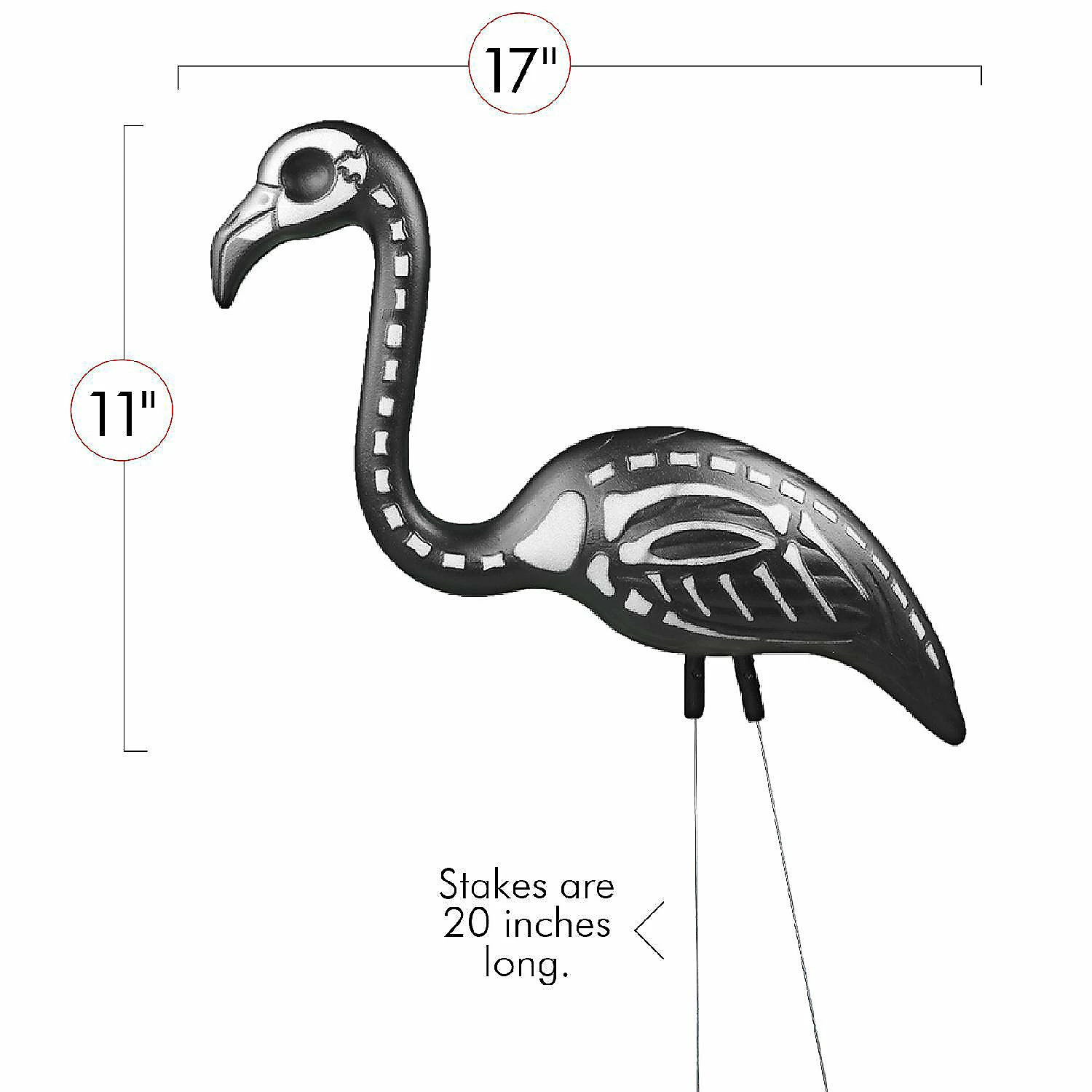 Set includes 2 different style Skeletal Flamingos and four 24” metal stakes.