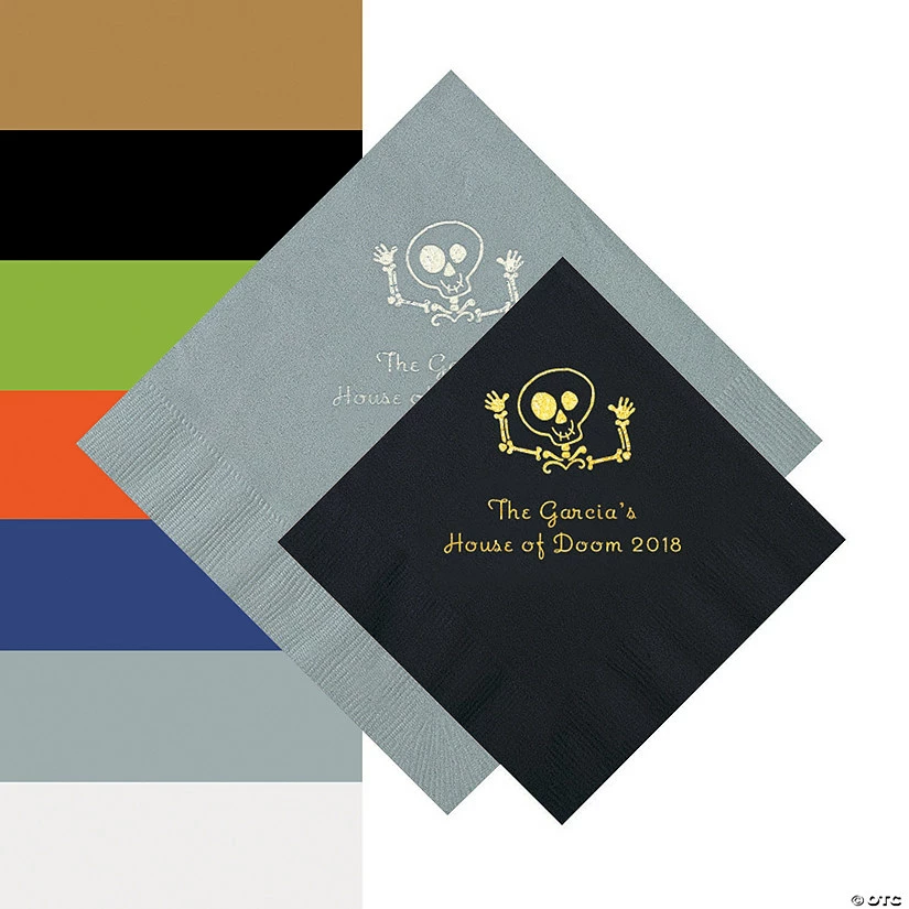 Nothing’s more Halloween than the sound of skeleton bones rattling around! OK, so these napkins don’t rattle, but they do feature a super Halloween-y skeleton printed in gold or silver foil. A great addition to your Halloween party supplies, these customized napkins will add some shine to the night when ghosts and skeletons really come to life. With your treats on these Halloween napkins, you’re sure to avoid the tricks! Personalize with two lines of text. Paper. (50 pcs. per unit) Beverage, 5″; luncheon, 6 1/2”. Not microwave safe. © OTC