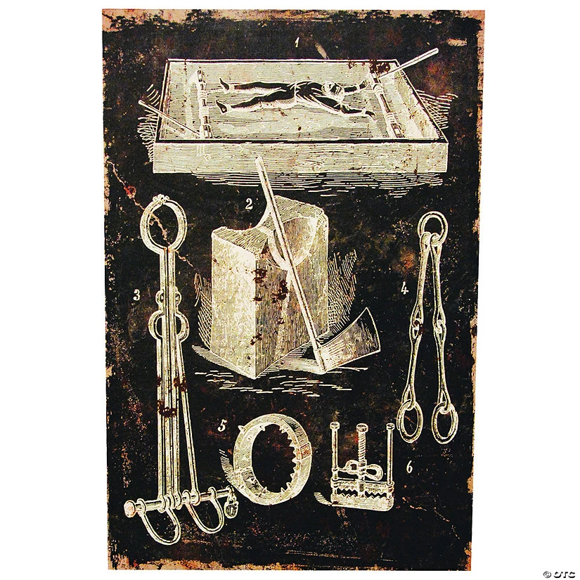 Distressed-look Torture Devices Canvas PrintMake your next haunted party just a touch more eerie with this canvas print of torture devices! Includes: Distressed-look canvas print on a pressed cardboard frame. The frame has a notch in the back for easy hanging. Measures 16″ x 24″ and 3/4 of an” deep.Special Shipping Information: This item ships separately from other items in your order. This item cannot ship to a P.O. Box. This item may be subject to additional processing days.ITEM IS NOT ELIGIBLE FOR EXPEDITED SHIPPING